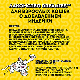 Аппетитная индейка в хрустящей вкусной подушечке не оставит равнодушным вашего питомца! Давайте вашему котику лакомые подушечки DREAMIES, когда хотите побаловать его. В состав лакомства входят важные для кошки питательные вещества, витамины и минералы, а значит, такое угощение приносит не только радость, но и пользу.