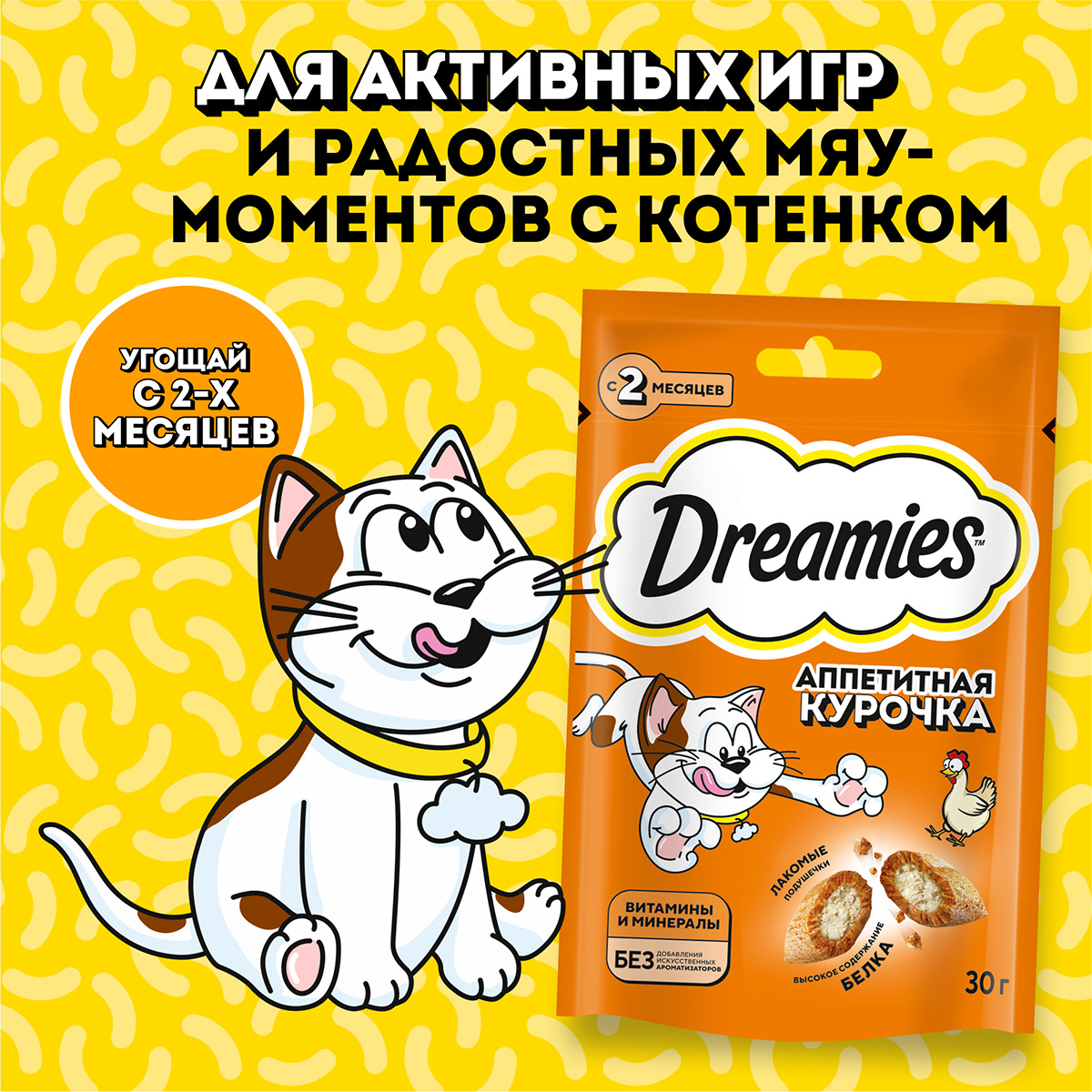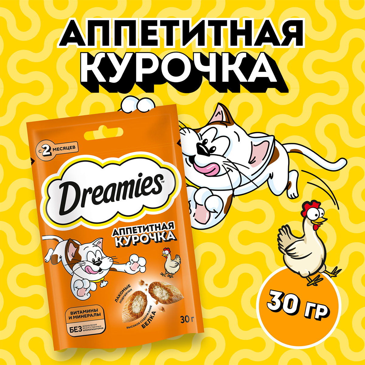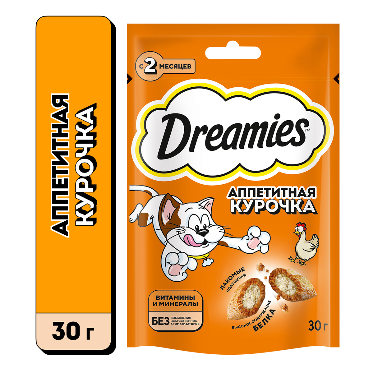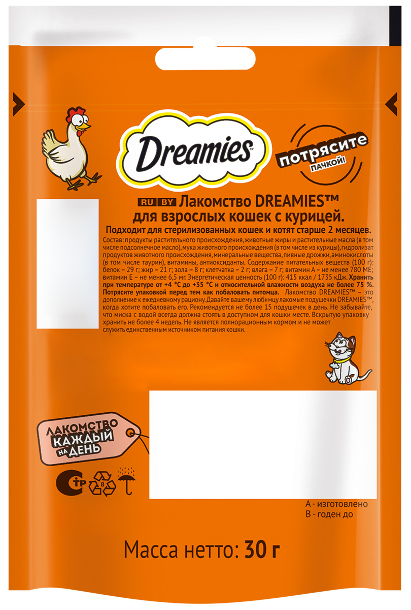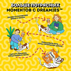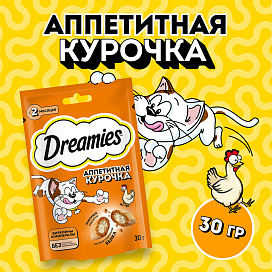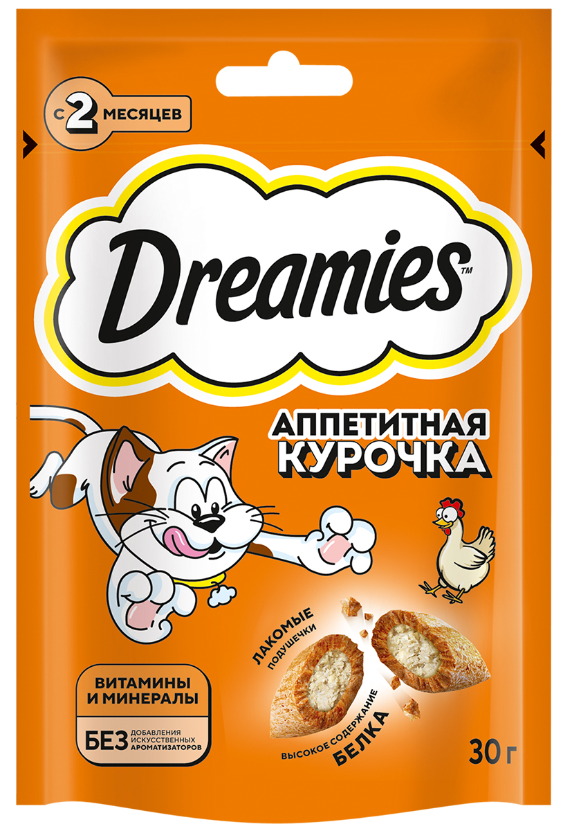 Аппетитная курочка в хрустящей вкусной подушечке не оставит равнодушным вашего питомца! Теперь ему не нужно охотиться, стоит только открыть упаковку и курочка никуда не убежит! Давайте вашему котику лакомые подушечки DREAMIES, когда хотите побаловать его. В состав лакомства входят важные для кошки питательные вещества, витамины и минералы, а значит, такое угощение приносит не только радость, но и пользу.
