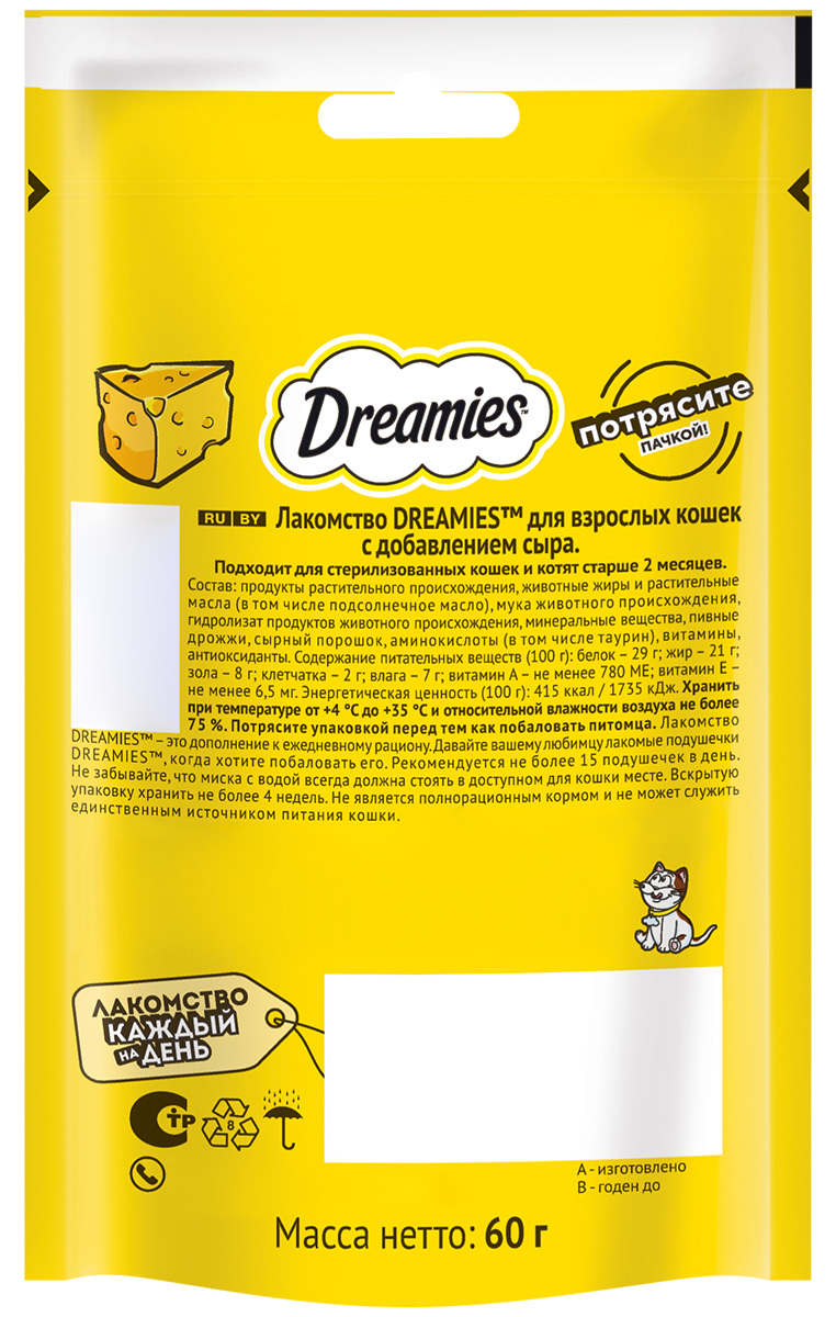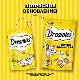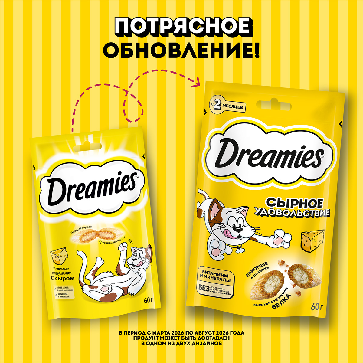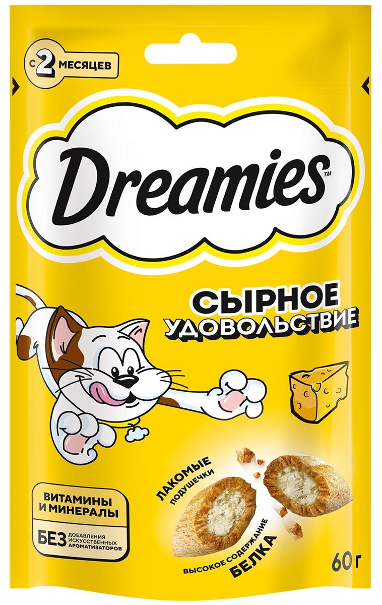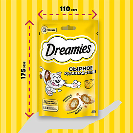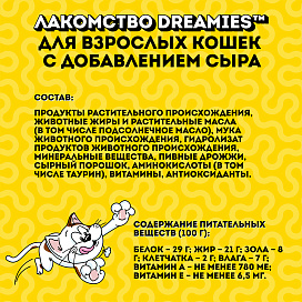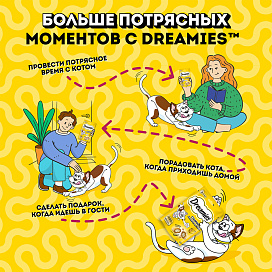 Не удивляйтесь, если при виде DREAMIES, ваш томный кот превратится в самое игривое существо на свете. Это все ради вкусной начинки внутри хрустящей подушечки. Давайте вашему котику лакомые подушечки DREAMIES, когда хотите побаловать его. В состав лакомства входят важные для кошки питательные вещества, витамины и минералы, а значит, такое угощение приносит не только радость, но и пользу.