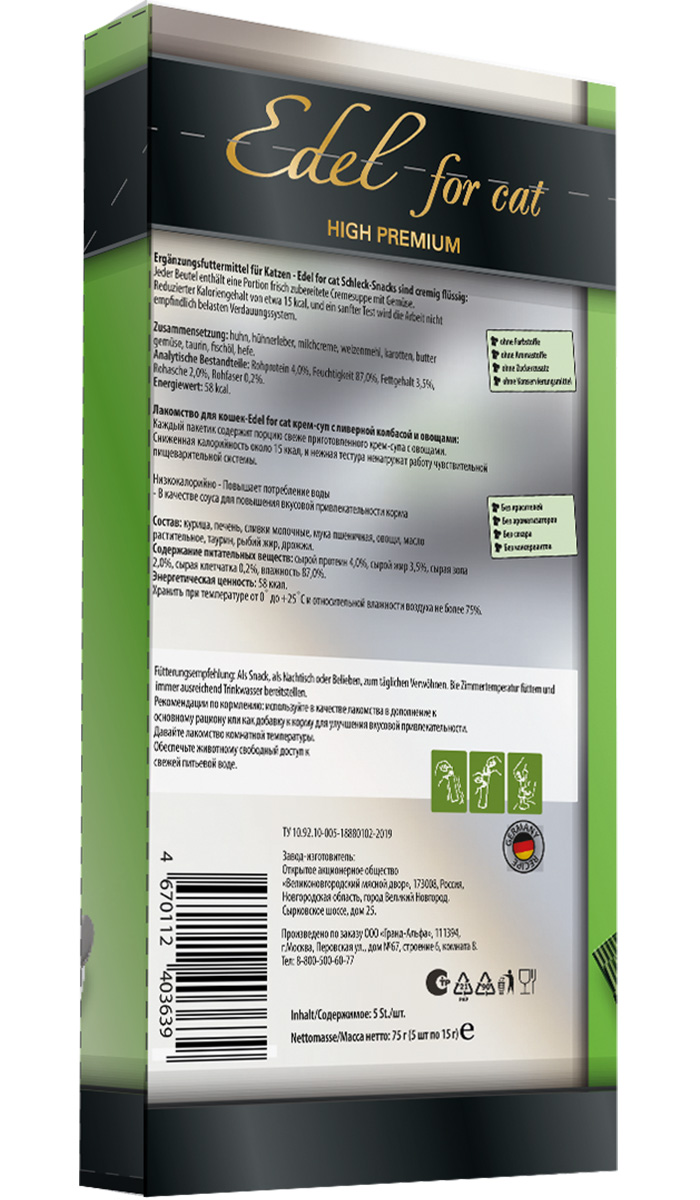 Лакомство Edel for cat для кошек крем-суп с ливерной колбасой и овощами.