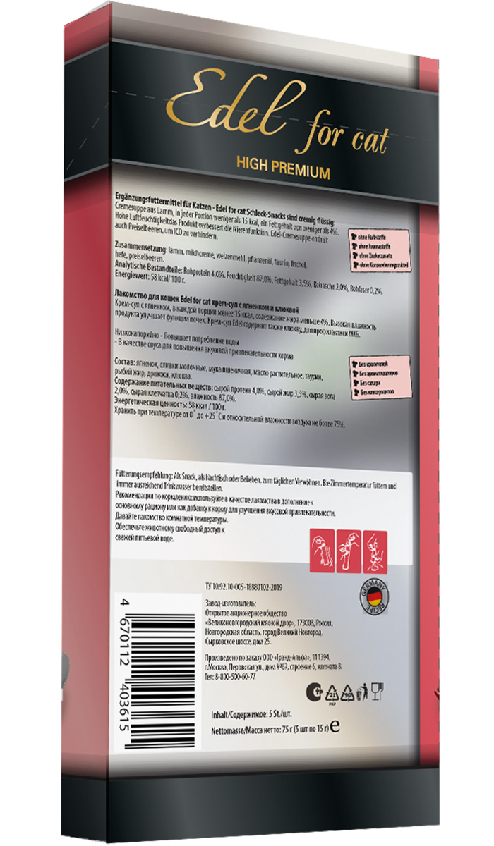 Лакомство для кошек EDEL FOR CAT крем-суп ягненок, клюква 75 гр (1 шт х 2)