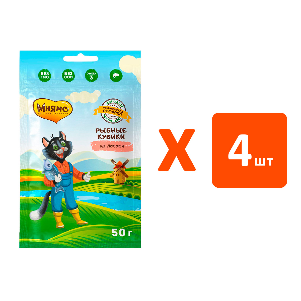 Лакомство для кошек МНЯМС КОТ ФЕДОР ФЕРМЕРСКАЯ ЯРМАРКА мясные кубики лосось 50 гр (1 шт х 4)
