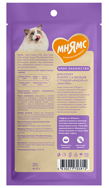 Крем-лакомство «Мнямс» с тунцом – это изысканное угощение с нежнейшей кремовой консистенцией! Основной ингредиент – тёмно-красное мясо деликатесного малого тунца и красное стейковое мясо желтопёрого тунца.