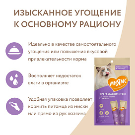 Утонченный вкус приводит кошек в восторг, а яркие эмоции довольных любимцев при кормлении с рук дарят хозяевам ощущение полного счастья. Подается как порционное угощение, или добавляется в виде аппетитного соуса к основному рациону для обогащения вкуса привычных блюд. Изготовлено по новейшей японской технологии и соответствует мировым стандартам качества. Удобная упаковка и кремовая текстура позволяют кормить кошку прямо с рук.