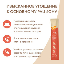 Утонченный вкус приводит кошек в восторг, а яркие эмоции довольных любимцев при кормлении с рук дарят хозяевам ощущение полного счастья. Подается как порционное угощение, или добавляется в виде аппетитного соуса к основному рациону для обогащения вкуса привычных блюд. Изготовлено по новейшей японской технологии и соответствует мировым стандартам качества.