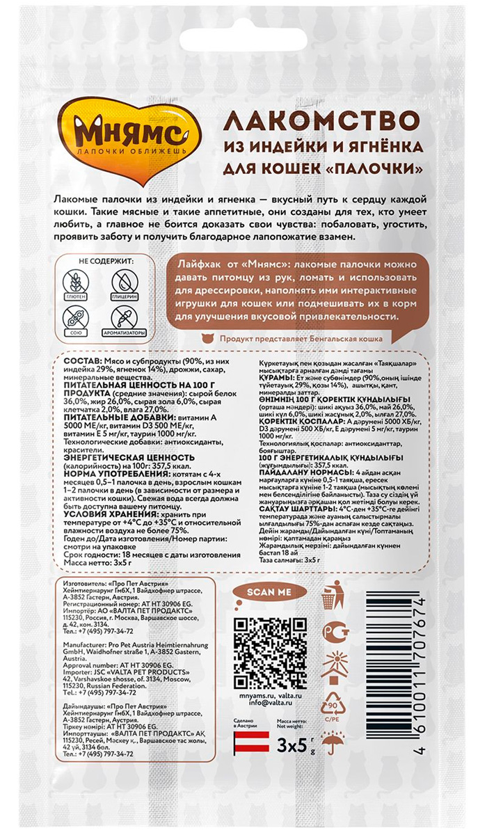 Лакомые палочки для кошек с индейкой и ягненком «Мнямс» – вкусное и здоровое угощение, от которого не откажется даже самая привередливая и избалованная кошка.