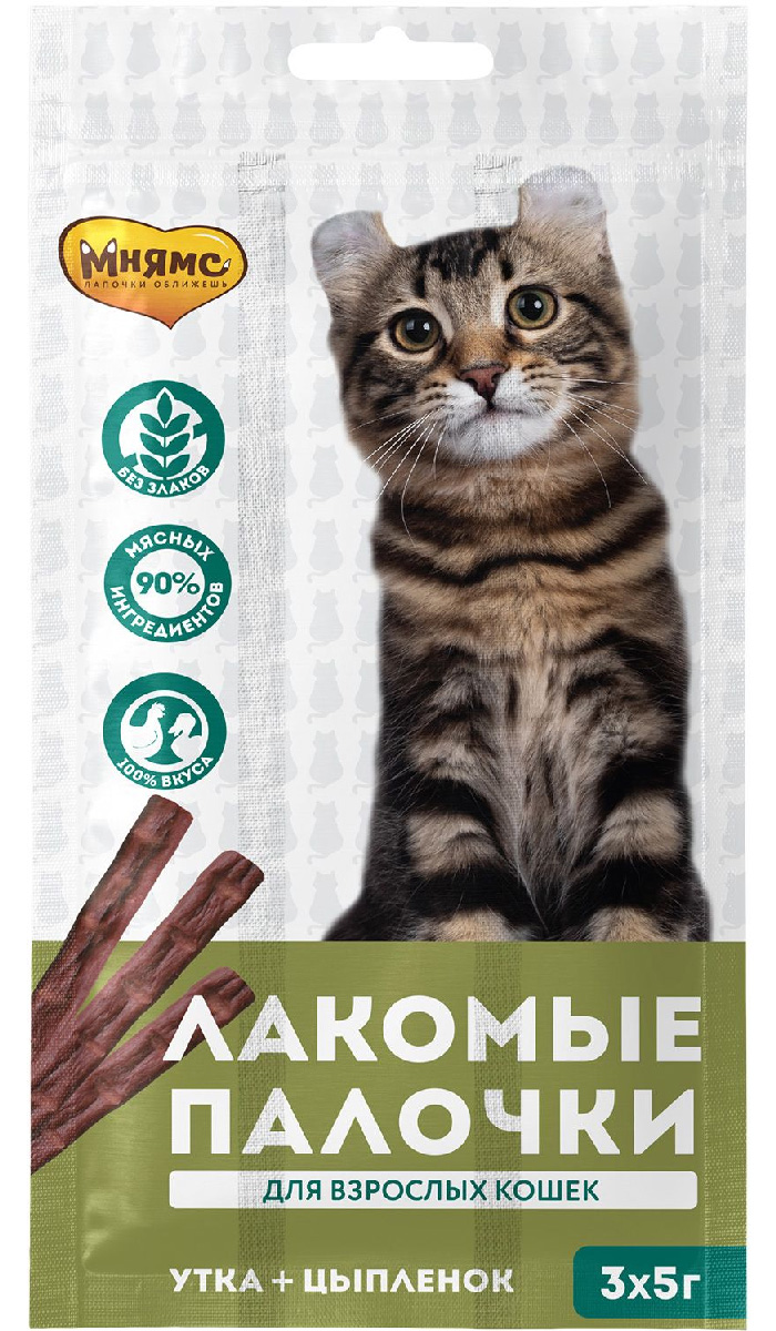 Лакомые палочки для кошек с цыпленком и уткой «Мнямс» – вкусное и здоровое угощение, от которого не откажется даже самая привередливая и избалованная кошка. Каждая палочка индивидуально упакована, что позволяет сохранить запах и вкусовые качества надолго. Без искусственных ароматизаторов и красителей.