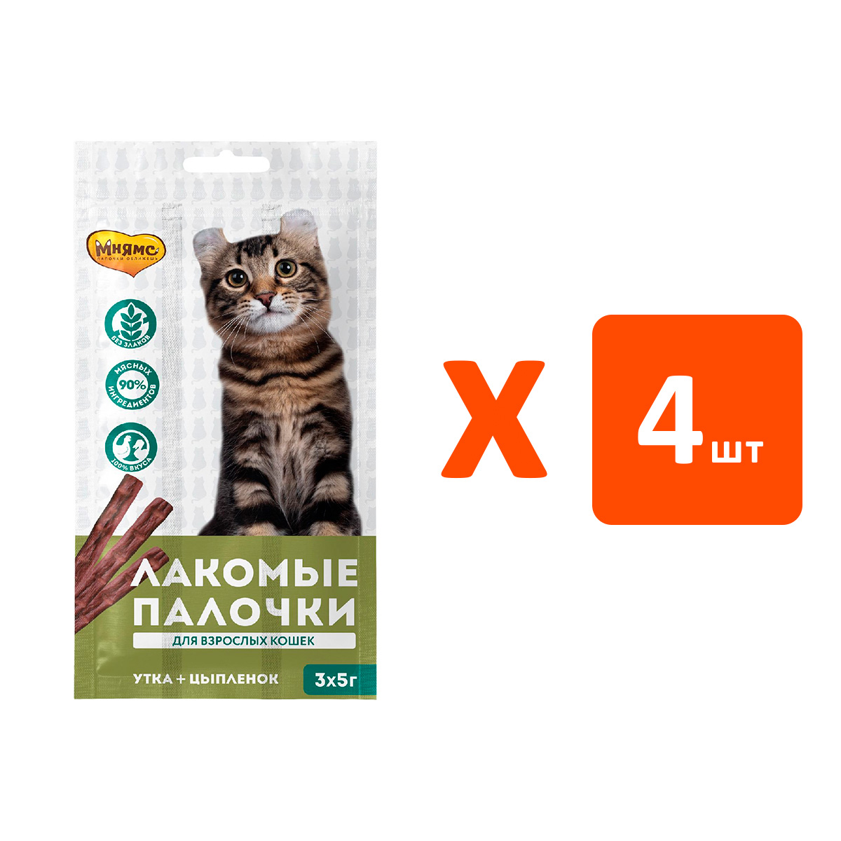 Лакомство для кошек МНЯМС лакомые палочки цыпленок, утка 15 гр (1 шт х 4)