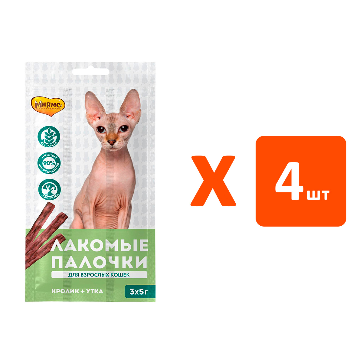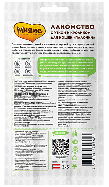 Лакомство для кошек МНЯМС лакомые палочки утка, кролик (15 гр х 4 шт)
