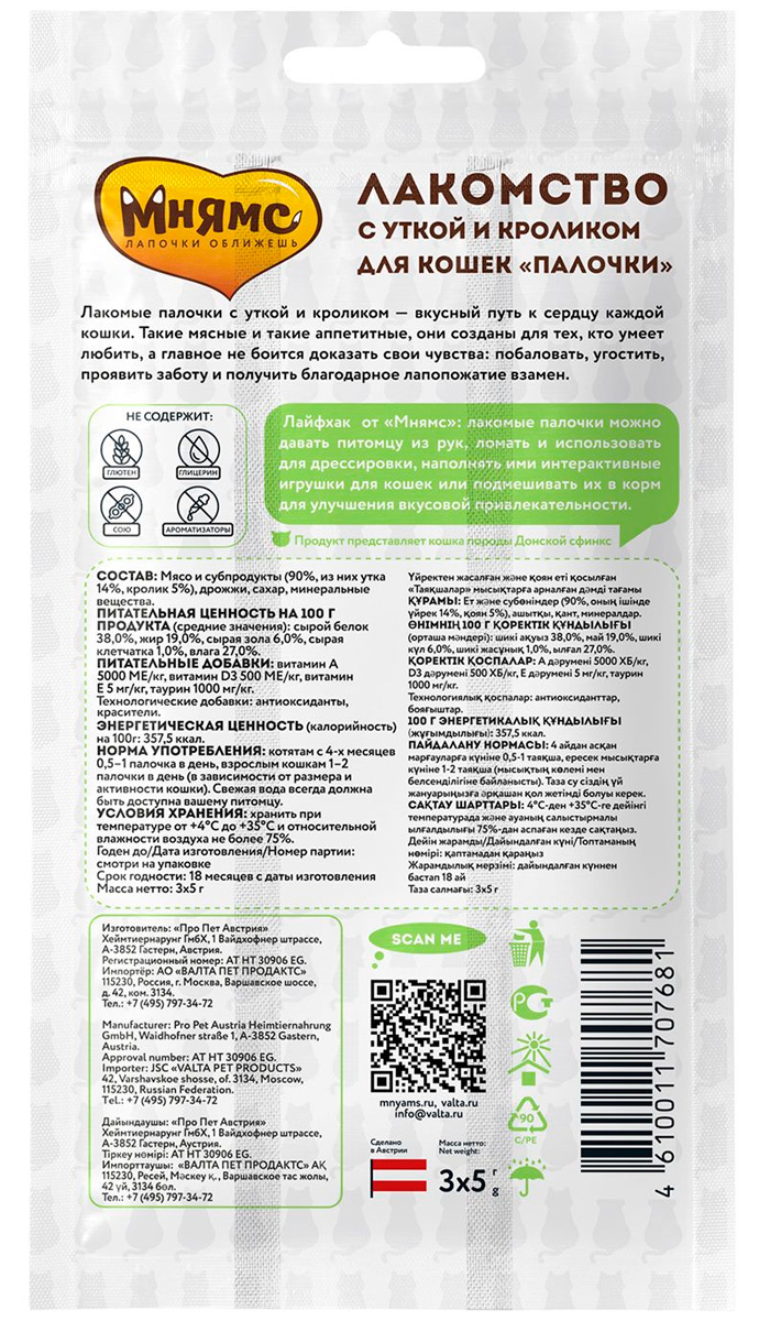Лакомые палочки для кошек с уткой и кроликом «Мнямс» – вкусное и здоровое угощение, от которого не откажется даже самая привередливая и избалованная кошка.