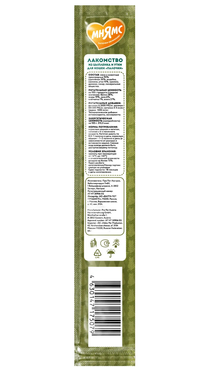 Мнямс лакомые палочки 13,5 см для кошек с цыпленком и уткой.
