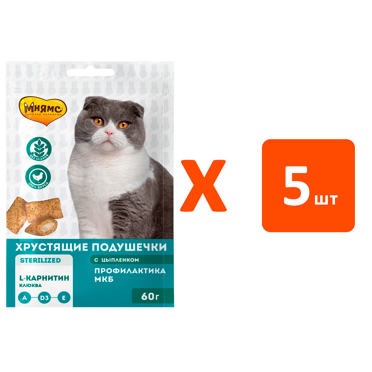 Лакомство для кошек МНЯМС ПРОФИЛАКТИКА МКБ хрустящие подушечки цыпленок, клюква (60 гр х 5 шт)