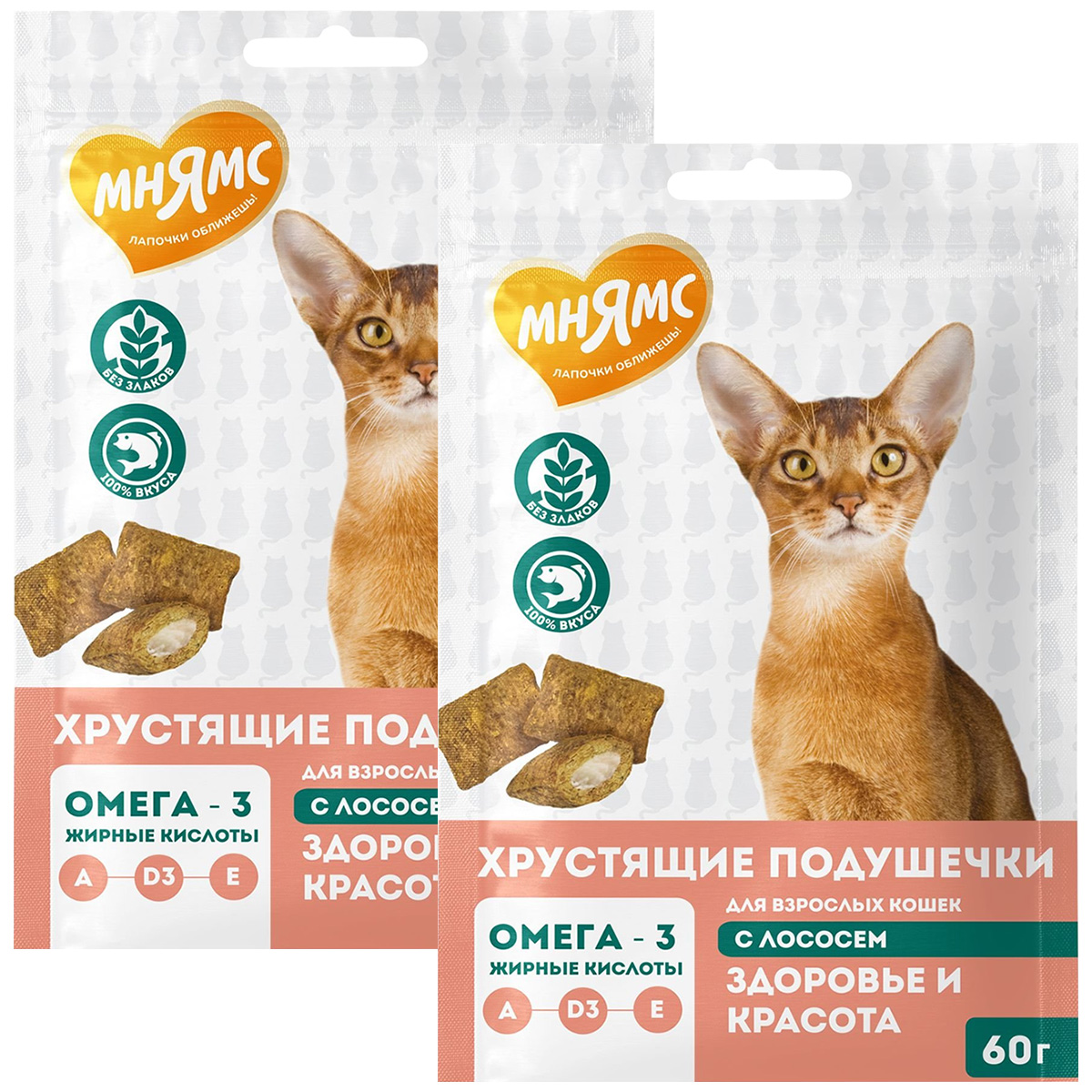 Лакомство для кошек МНЯМС ЗДОРОВЬЕ И КРАСОТА хрустящие подушечки лосось (60 гр х 2 шт)
