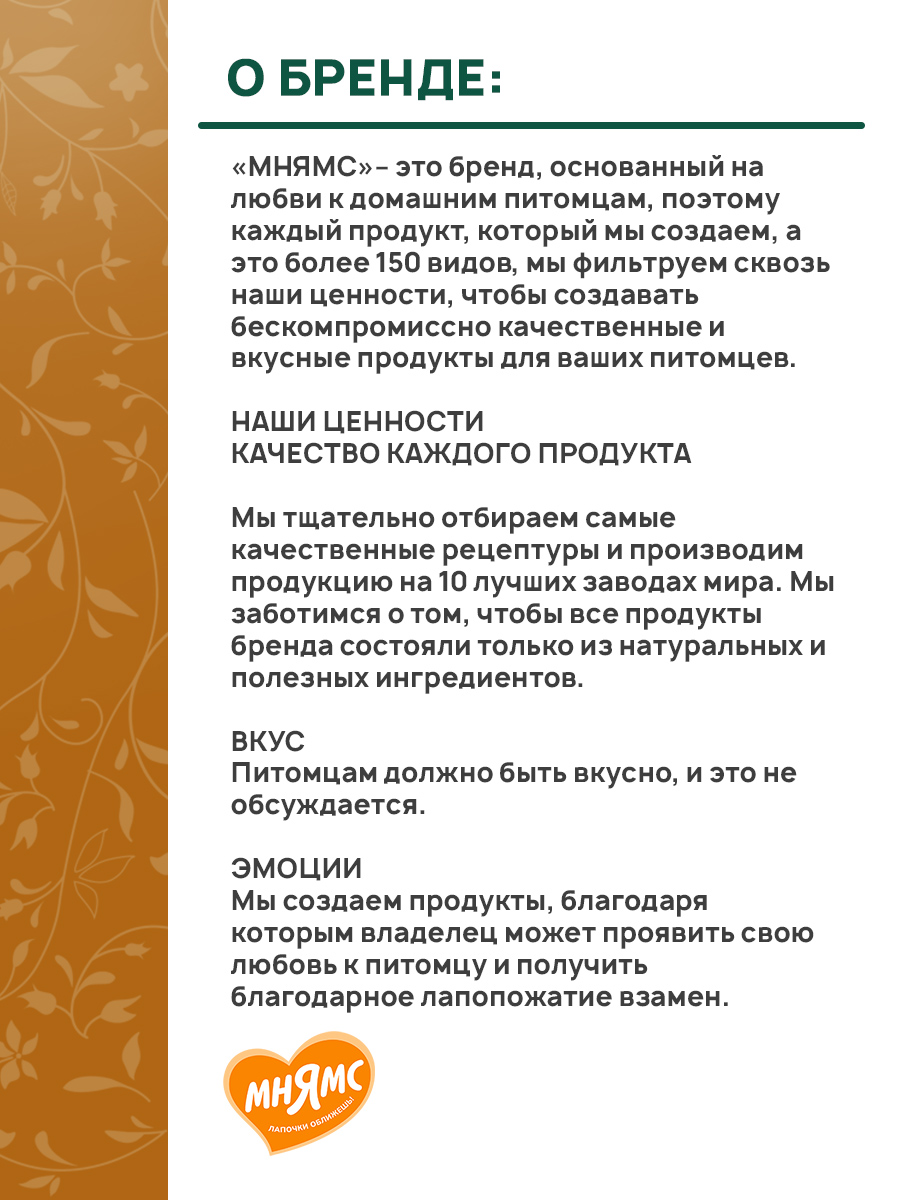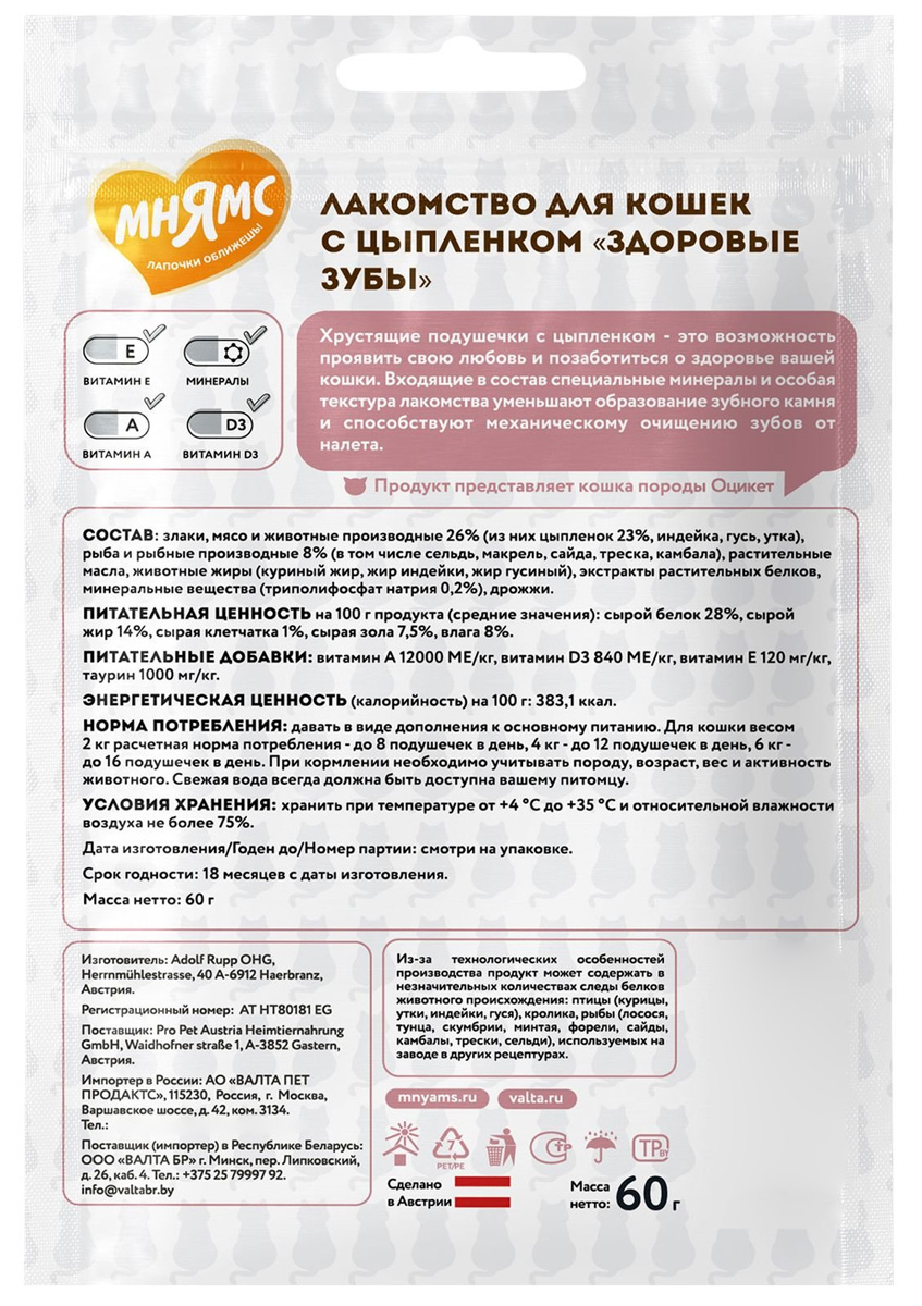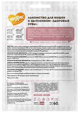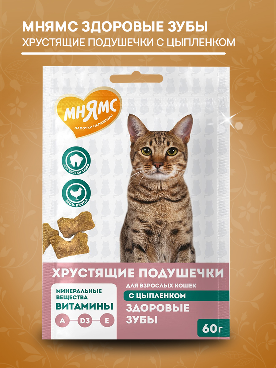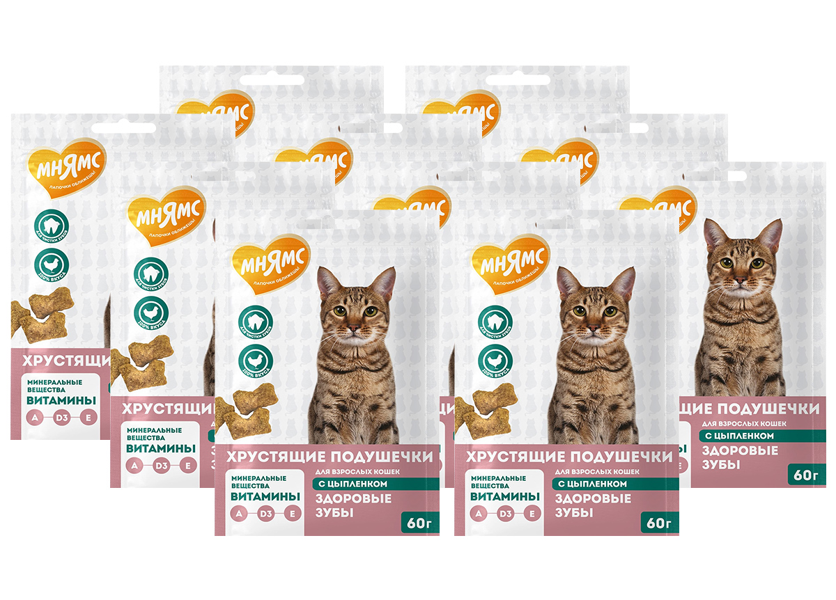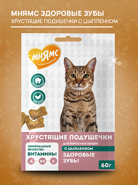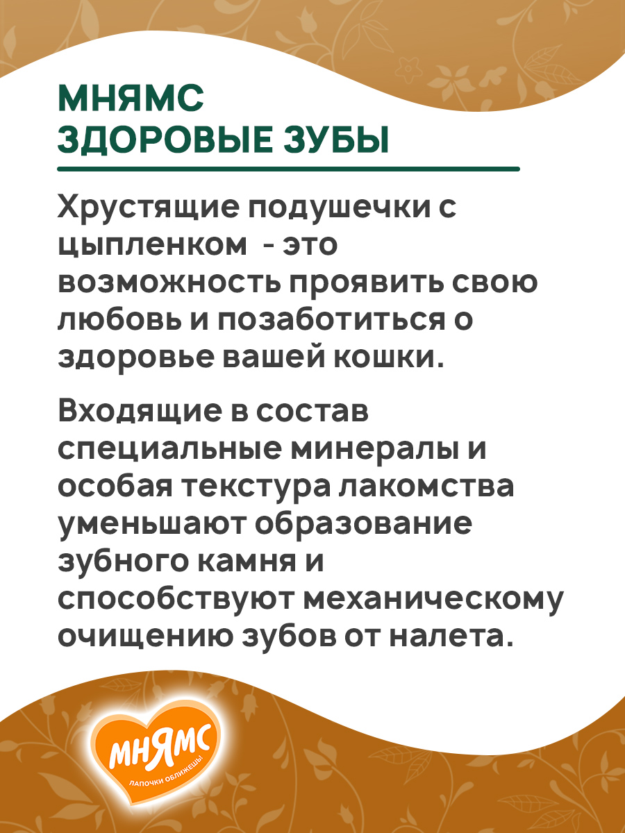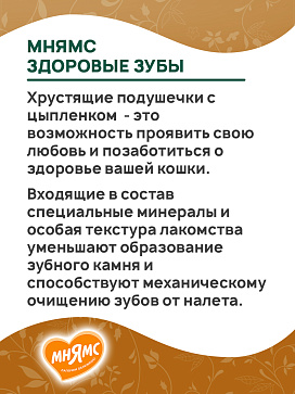 Лакомство для кошек МНЯМС ЗДОРОВЫЕ ЗУБЫ хрустящие подушечки цыпленок (60 гр х 10 шт)