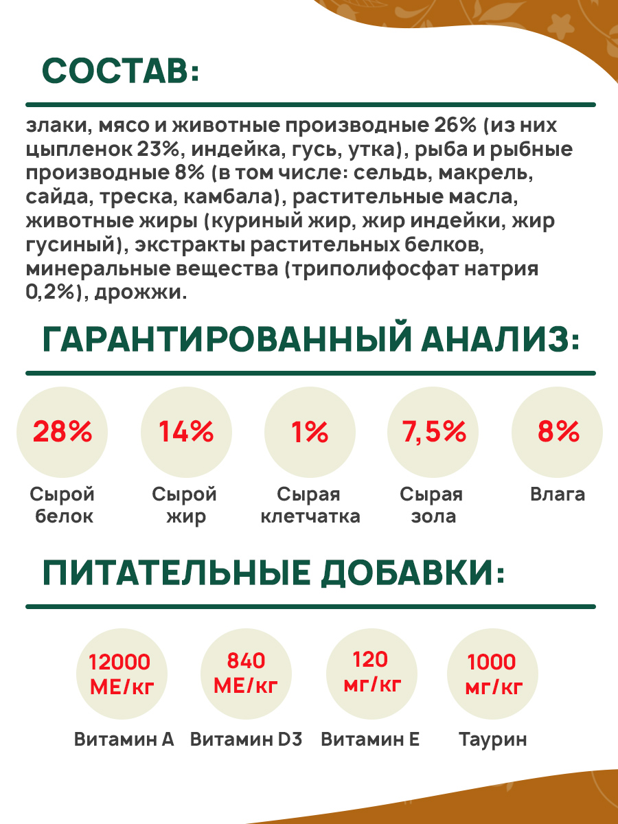 Состав: злаки, мясо и животные производные 26% (из них цыпленок 23%, индейка, гусь, утка), рыба и рыбные производные 8% (в том числе: сельдь, макрель, сайда, треска, камбала), растительные масла, животные жиры (куриный жир, жир индейки, жир гусиный), экстракты растительных белков, минеральные вещества (триполифосфат натрия 0,2%), дрожжи.