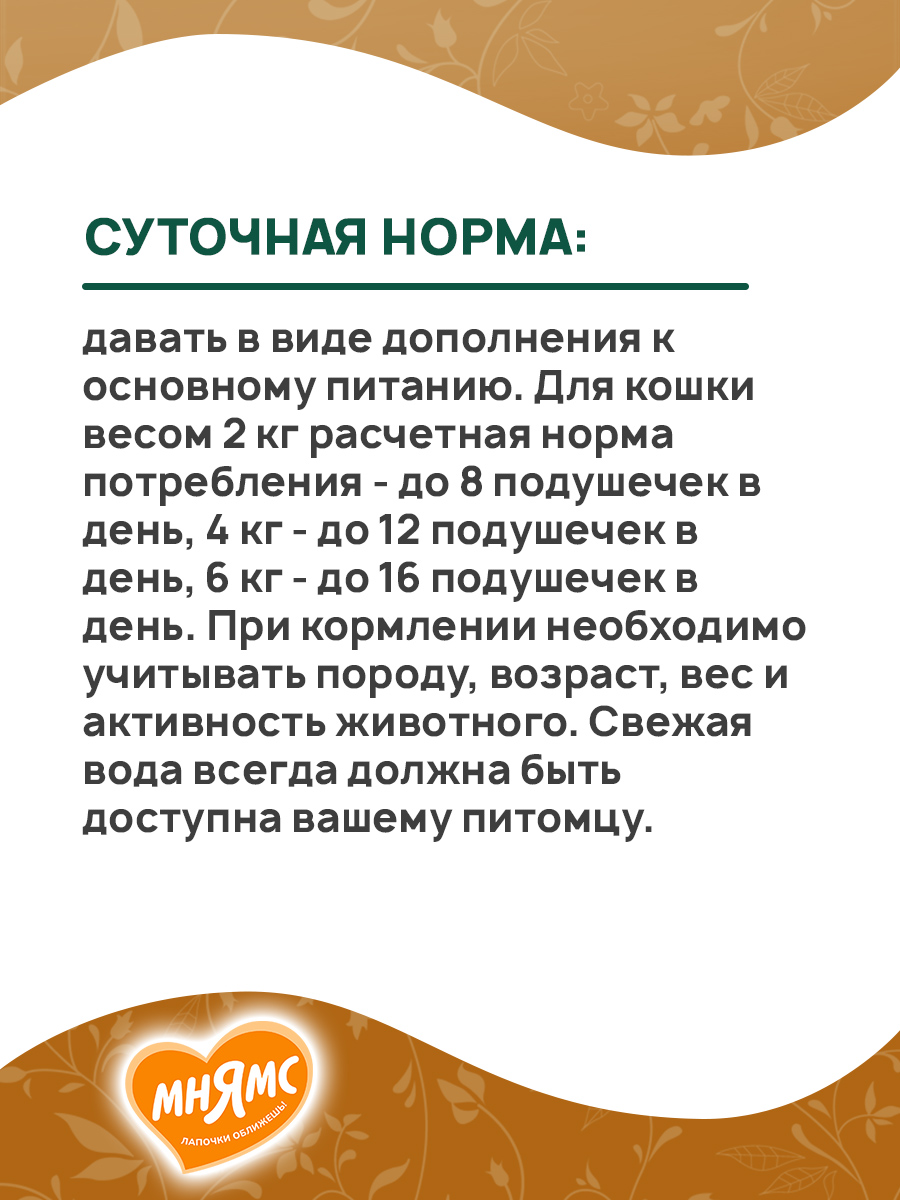 Суточная норма: давать в виде дополнения к основному питанию. Для кошки весом 2 кг расчетная норма потребления - до 8 подушечек в день, 4 кг - до 12 подушечек в день, 6 кг - до 16 подушечек в день. При кормлении необходимо учитывать породу, возраст, вес и активность животного. Свежая вода всегда должна быть доступна вашему питомцу.