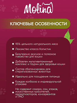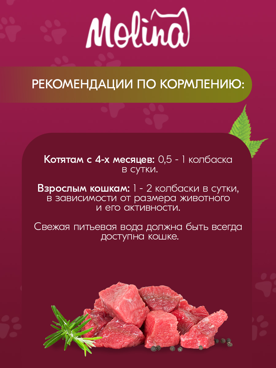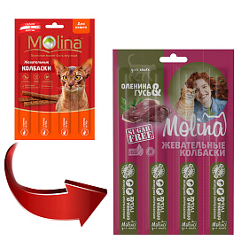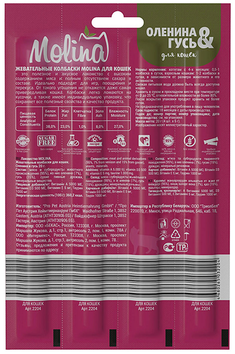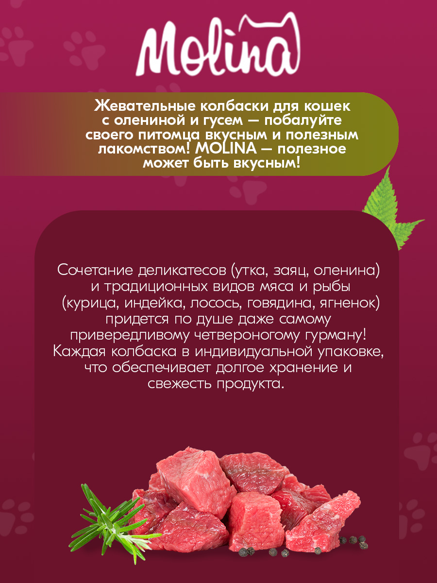 Жевательные колбаски для кошек с олениной и гусем – побалуйте своего питомца вкусным и полезным лакомством! MOLINA – полезное может быть вкусным!Ключевые особенности: