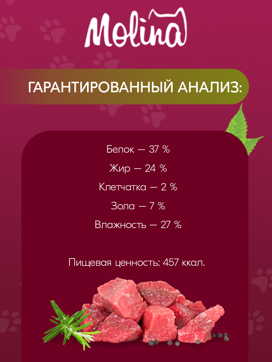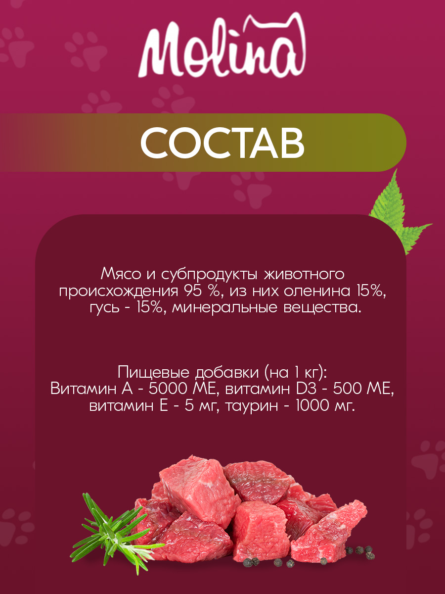 - 95% цельного натурального мяса, из них оленина 15%, мясо гуся - 15%