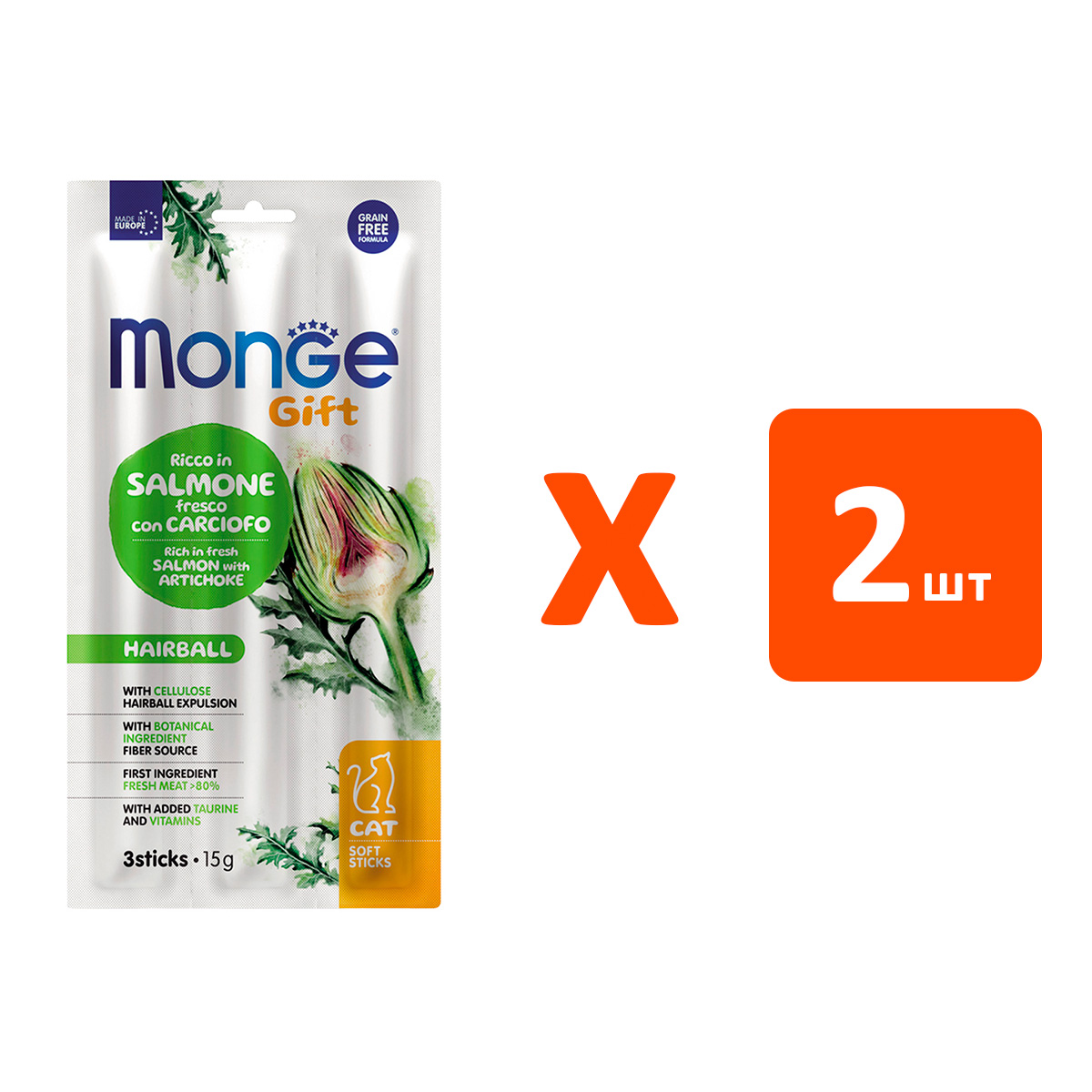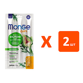 Лакомство для кошек MONGE GIFT HAIRBALL мягкие палочки для вывода шерсти лосось, артишок 15 гр (1 шт х 2)