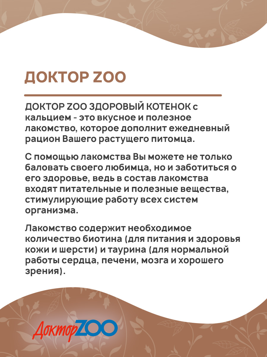 ДОКТОР ZOO ЗДОРОВЫЙ КОТЕНОК с кальцием - это вкусное и полезное лакомство, которое дополнит ежедневный рацион Вашего растущего питомца.