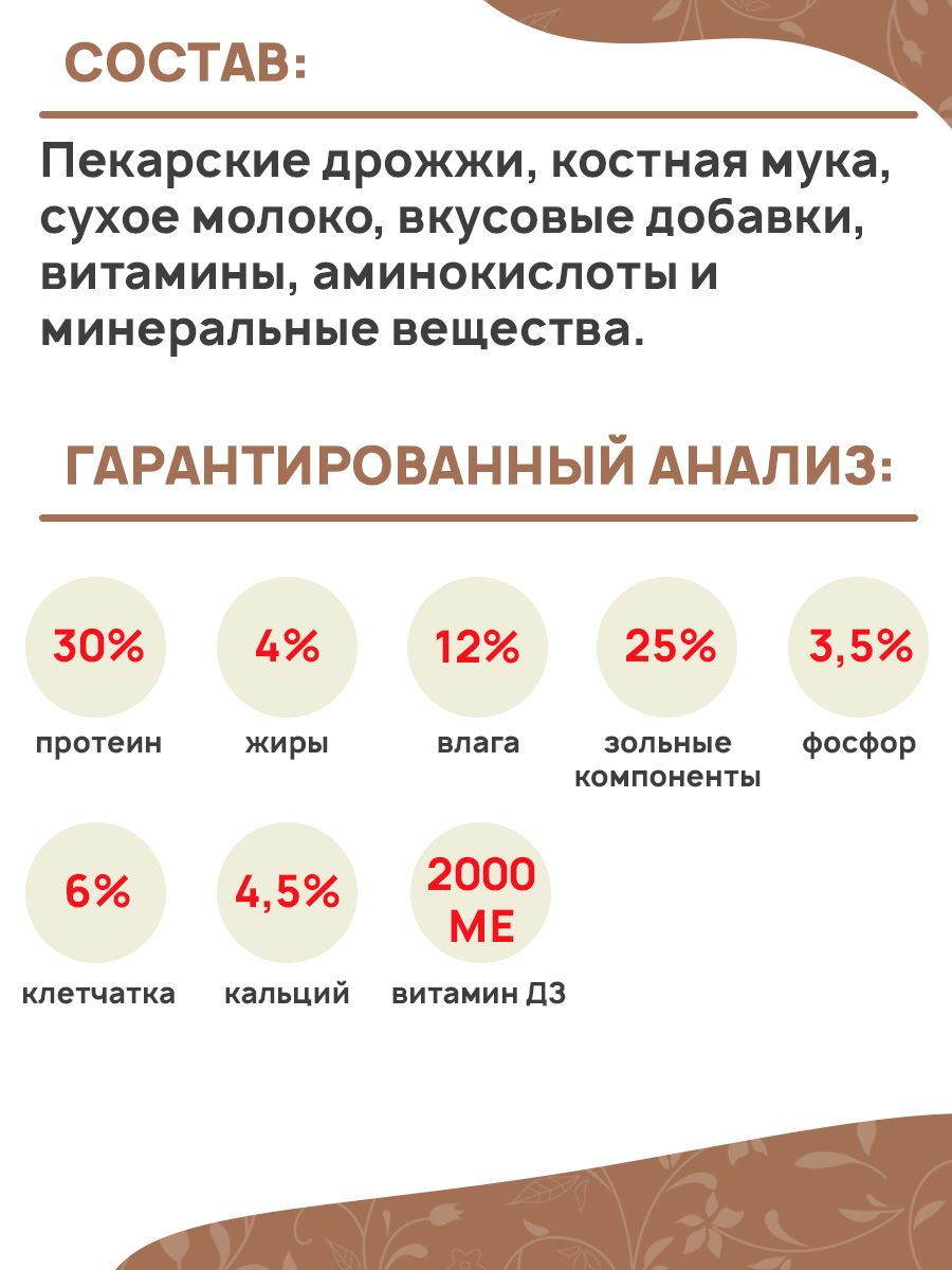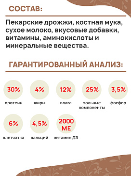 Пекарские дрожжи, костная мука, сухое молоко, вкусовые добавки, витамины, аминокислоты и минеральные вещества.