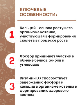 Уникальная формула для котят содержит все главные микроэлементы, витамины группы В и витамин D3, которые способствуют хорошей работе всех внутренних органов, правильному обмен веществ и укреплению иммунитета.