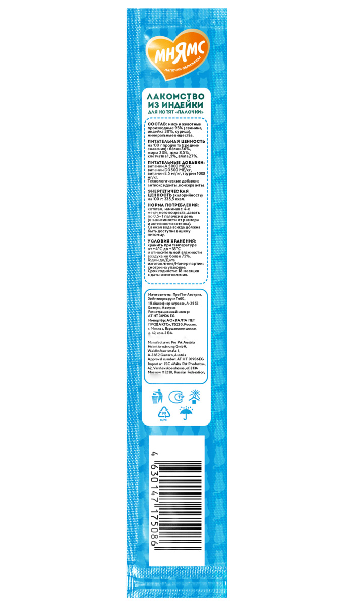 Мнямс лакомые палочки 13,5 см для котят с индейкой.