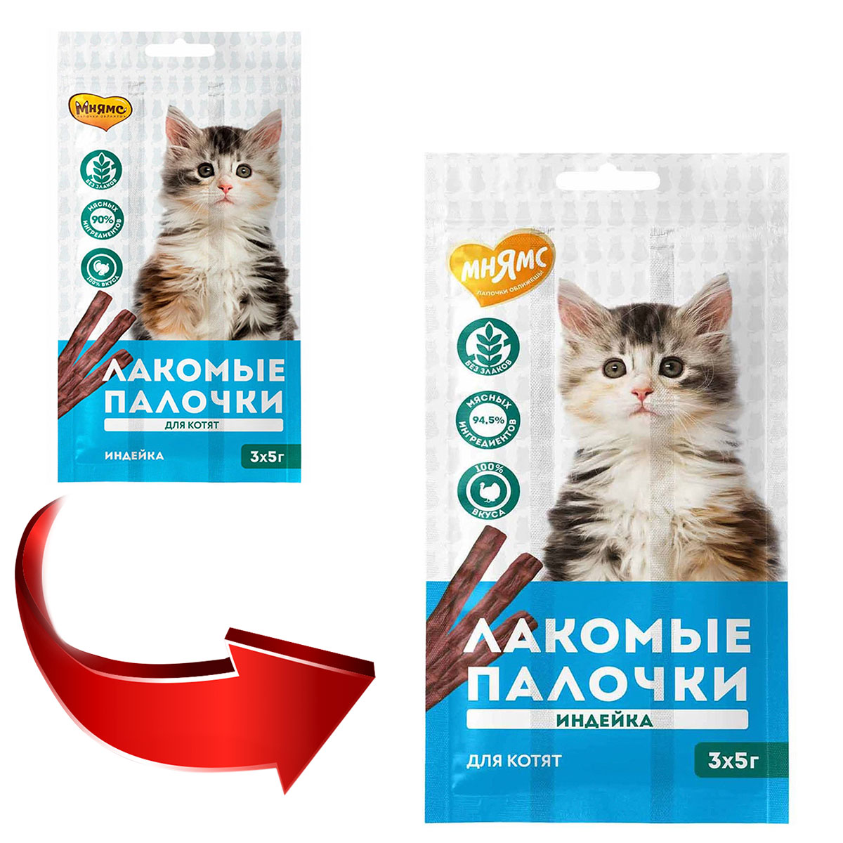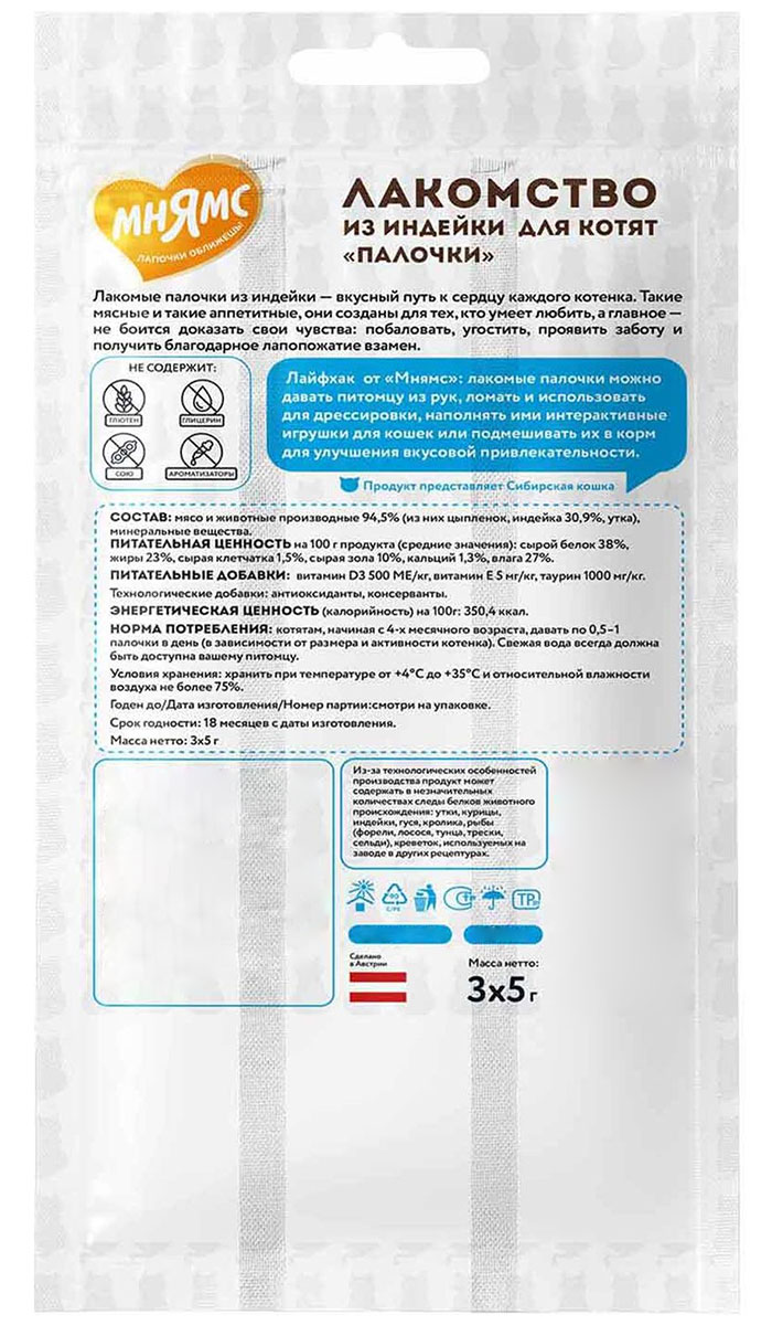Лакомство для котят МНЯМС палочки индейка уп. 3 шт по 5 гр (1 шт х 4)