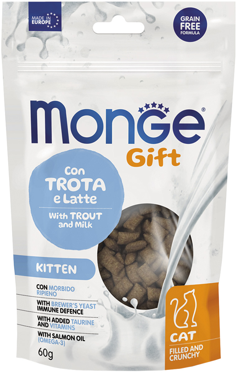 Лакомство для котят MONGE GIFT KITTEN подушечки форель, молоко 60 гр (1 шт)