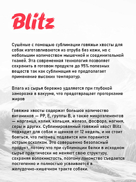 Сублимированное лакомство для собак Blitz «Хвост» — это не просто удовольствие и радость для Вашего питомца, но и натуральный способ укрепить его здоровье.