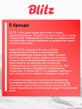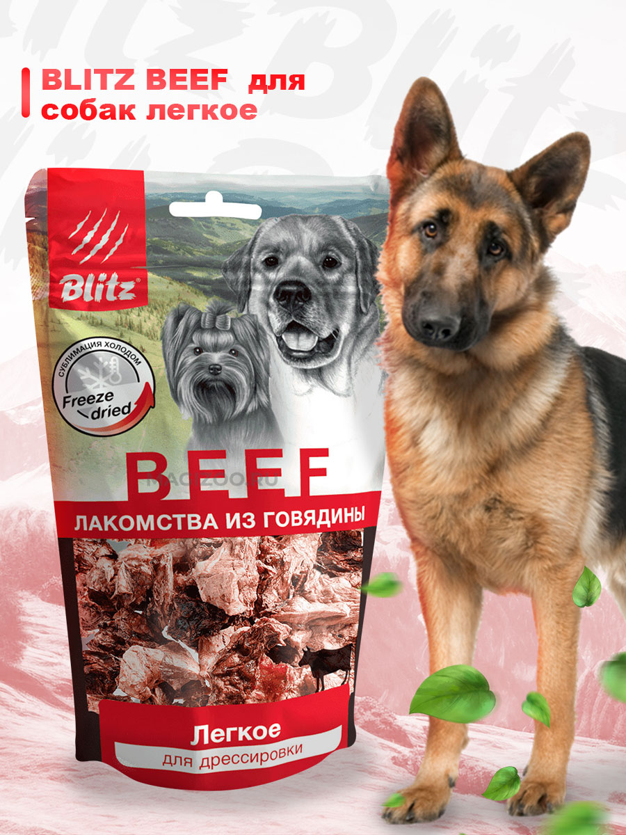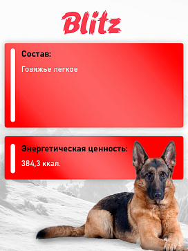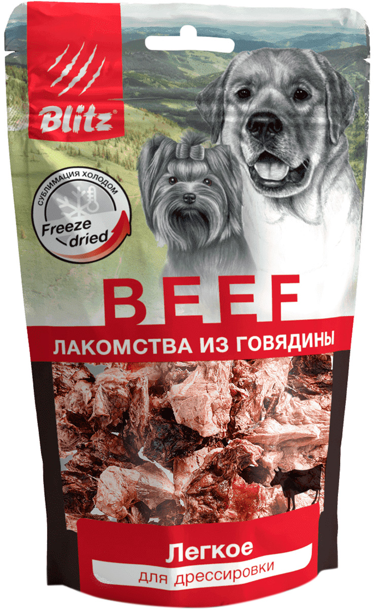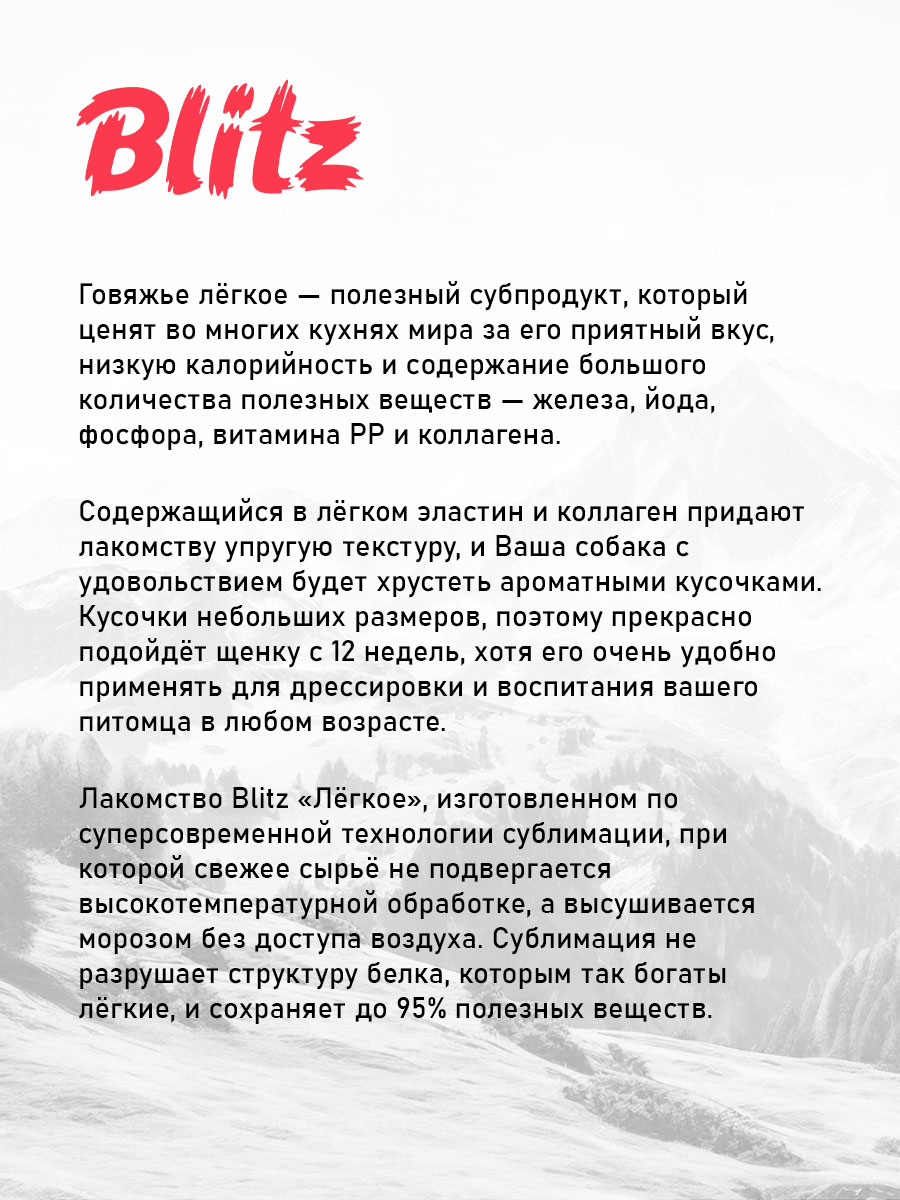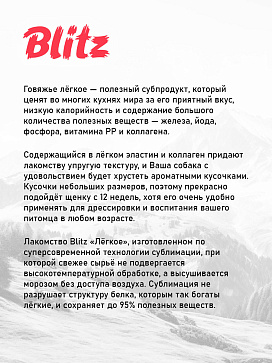 Лакомство Blitz «Лёгкое», изготовленном по суперсовременной технологии сублимации, при которой свежее сырьё не подвергается высокотемпературной обработке, а высушивается морозом без доступа воздуха. Сублимация не разрушает структуру белка, которым так богаты лёгкие, и сохраняет до 95% полезных веществ.