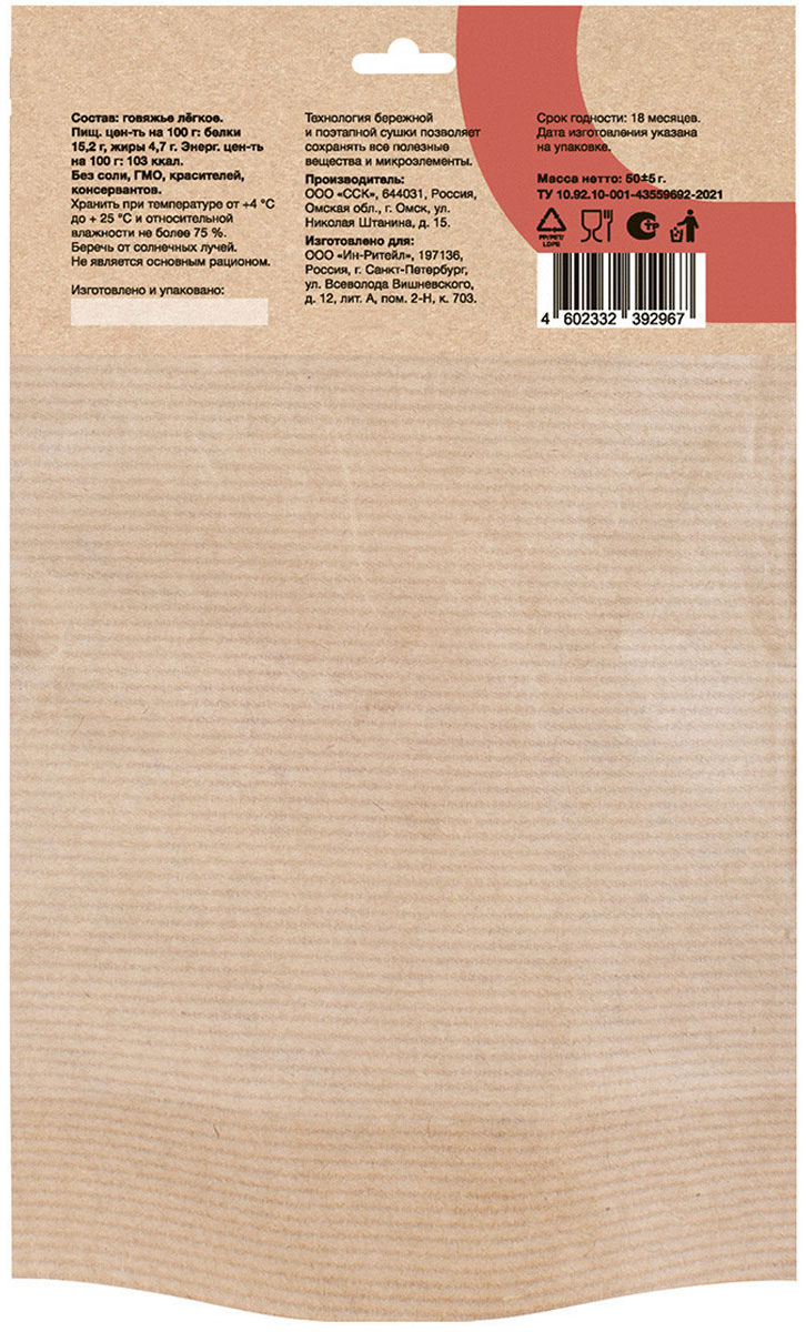 Натуральное лакомство приготовлено по бережной технологии вяления, которая позволяет сохранять все полезные минеральные вещества и витамины.