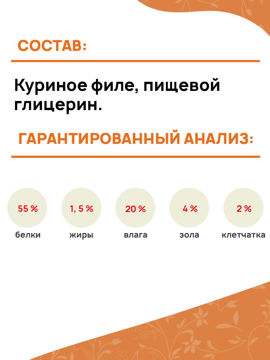 Лакомство обладает уникальной рецептурой, сохраняющей все полезные качества курицы и неповторимый вкус безо всяких добавок и консервантов.