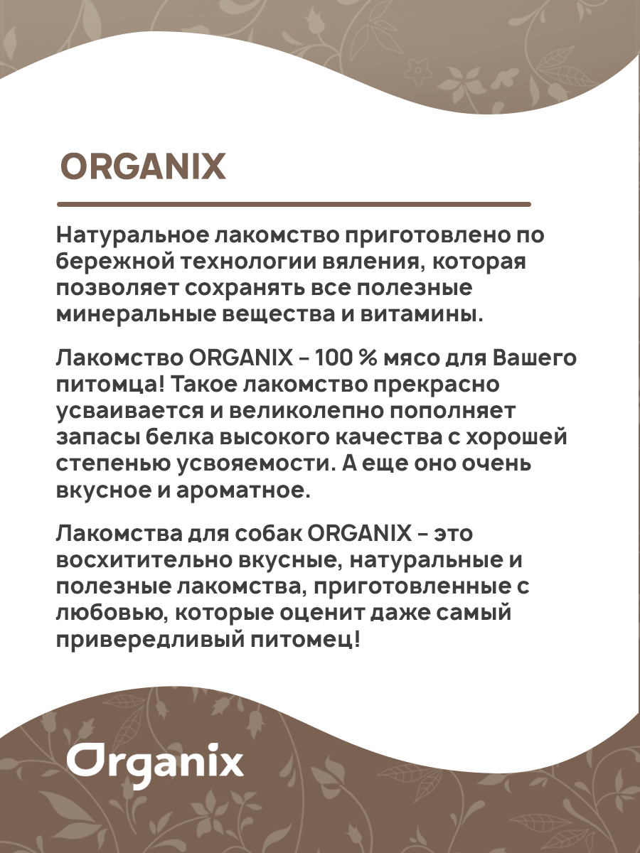 Лакомство ORGANIX – 100 % мясо для Вашего питомца! Такое лакомство прекрасно усваивается и великолепно пополняет запасы белка высокого качества с хорошей степенью усвояемости. А еще оно очень вкусное и ароматное!