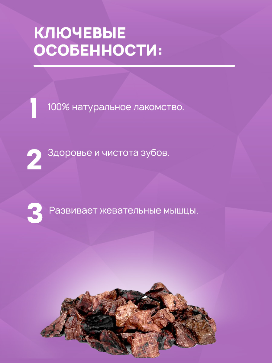 Натуральное хрустящее лакомство, богатое соединительной и хрящевой тканью. Предотвращает образование зубного налета и камня, избавляет от неприятного запаха из пасти, а также укрепляет десны и развивает жевательные мышцы.