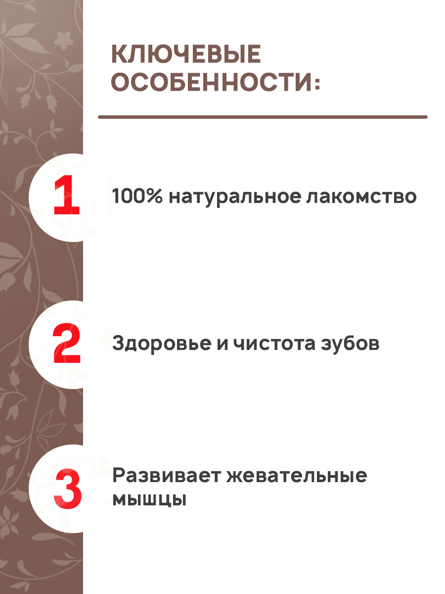 Натуральное хрустящее лакомство, богатое соединительной и хрящевой тканью. Предотвращает образование зубного налета и камня, избавляет от неприятного запаха из пасти, а также укрепляет десны и развивает жевательные мышцы.