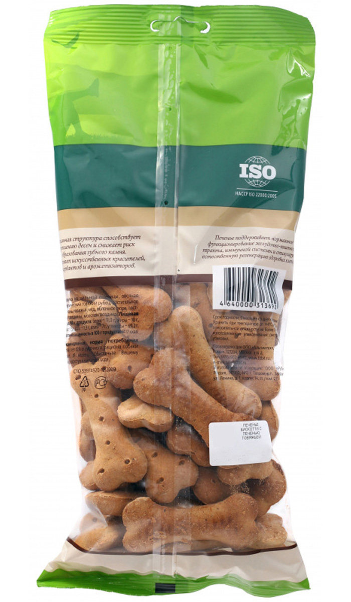 Состав: мука из цельной пшеницы, овсяная крупа, диетический говяжий рубец, растительное масло, печень говяжья, мед, яблочное пюре, постное мясо говядины, молотая гвоздика.