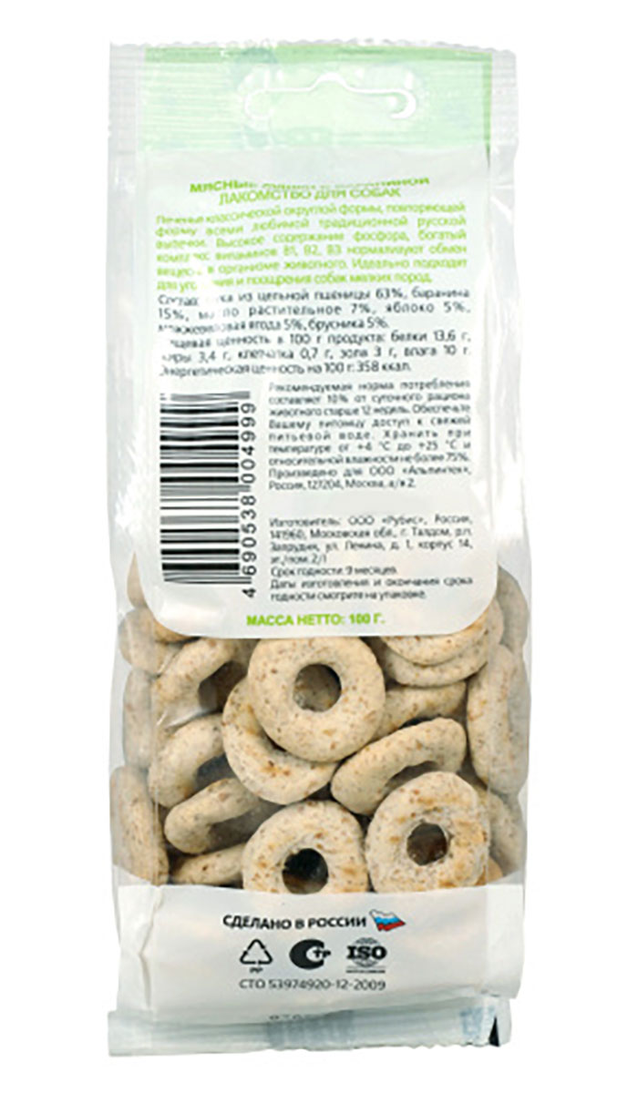 Состав: мука из цельной пшеницы 63%, говядина 15%, масло растительное 7%, яблоко 5%, можжевеловая ягода 5%, брусника 5%.