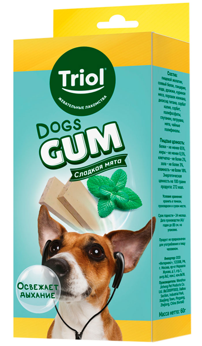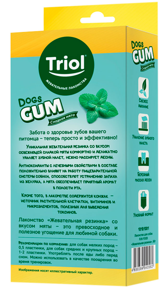 Забота о здоровье вашего питомца - теперь просто и эффективно! Уникальная жевательная резинка со вкусом освежающей сладкой мяты комфортно и деликатно удаляет зубной налет, нежно массирует десны. Антиоксиданты с лечебными свойствами в составе положительно влияют на работу пищеварительной системы собаки, способствуют устранению запаха из желудка, а мята обеспечивает приятный аромат в полости рта. Кроме того, в лакомстве содержится конжак - источник растительной клетчатки, витаминов и микроэлементов, полезных для выведения токсинов.