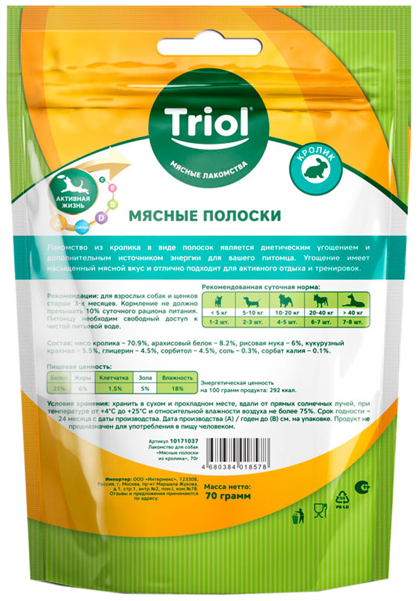 Лакомство для собак TRIOL полоски мясные кролик 70 гр (1 шт)