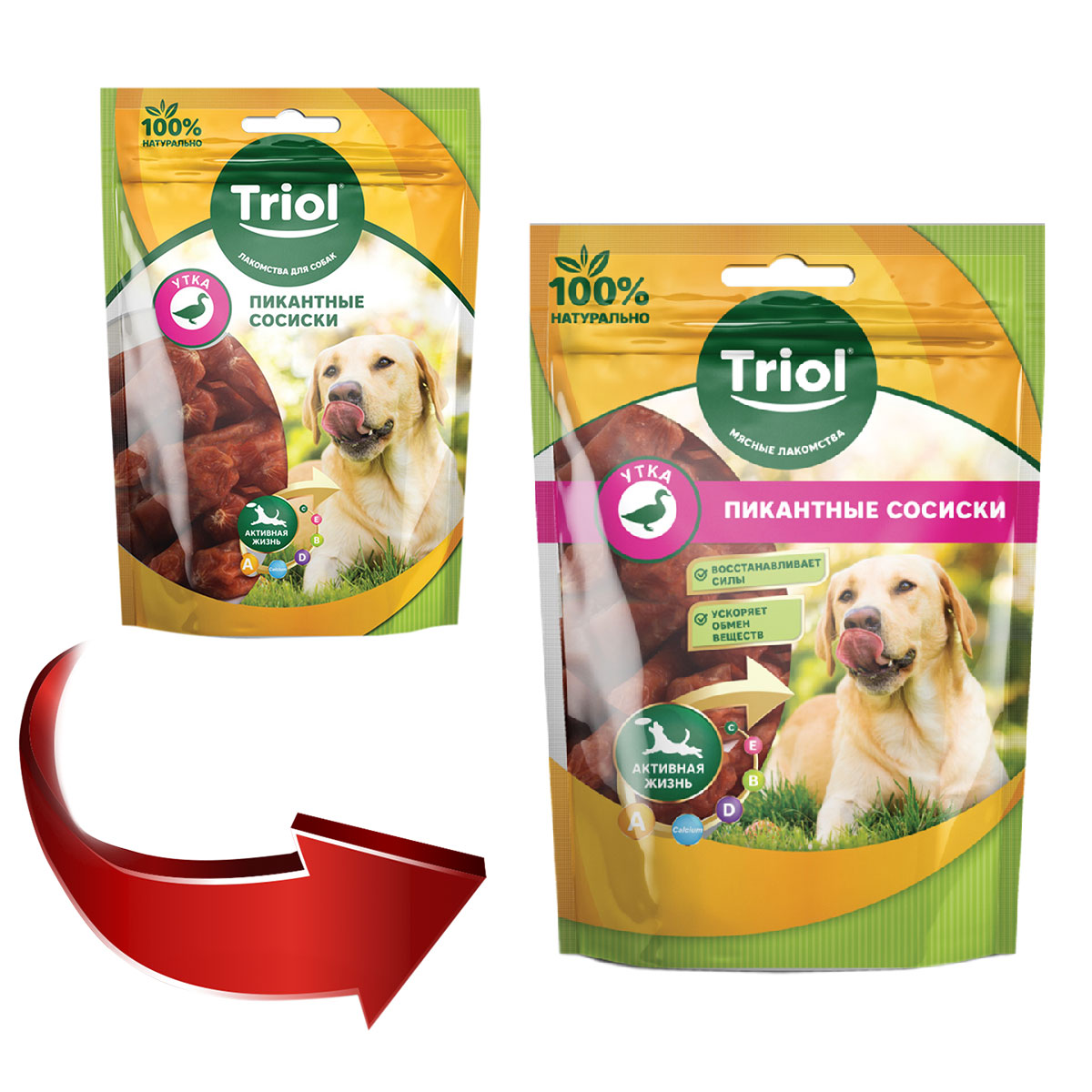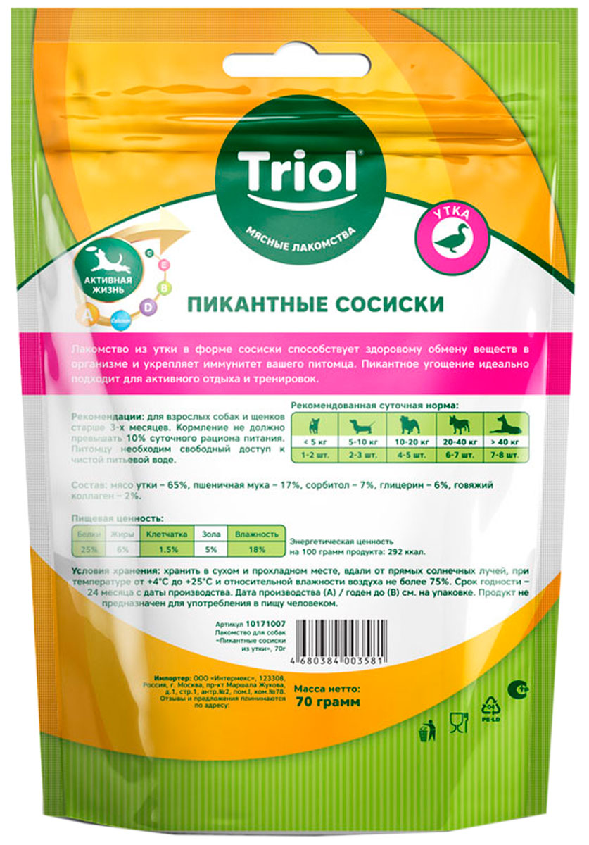 Лакомство для собак TRIOL сосиски пикантные утка 70 гр (1 шт)