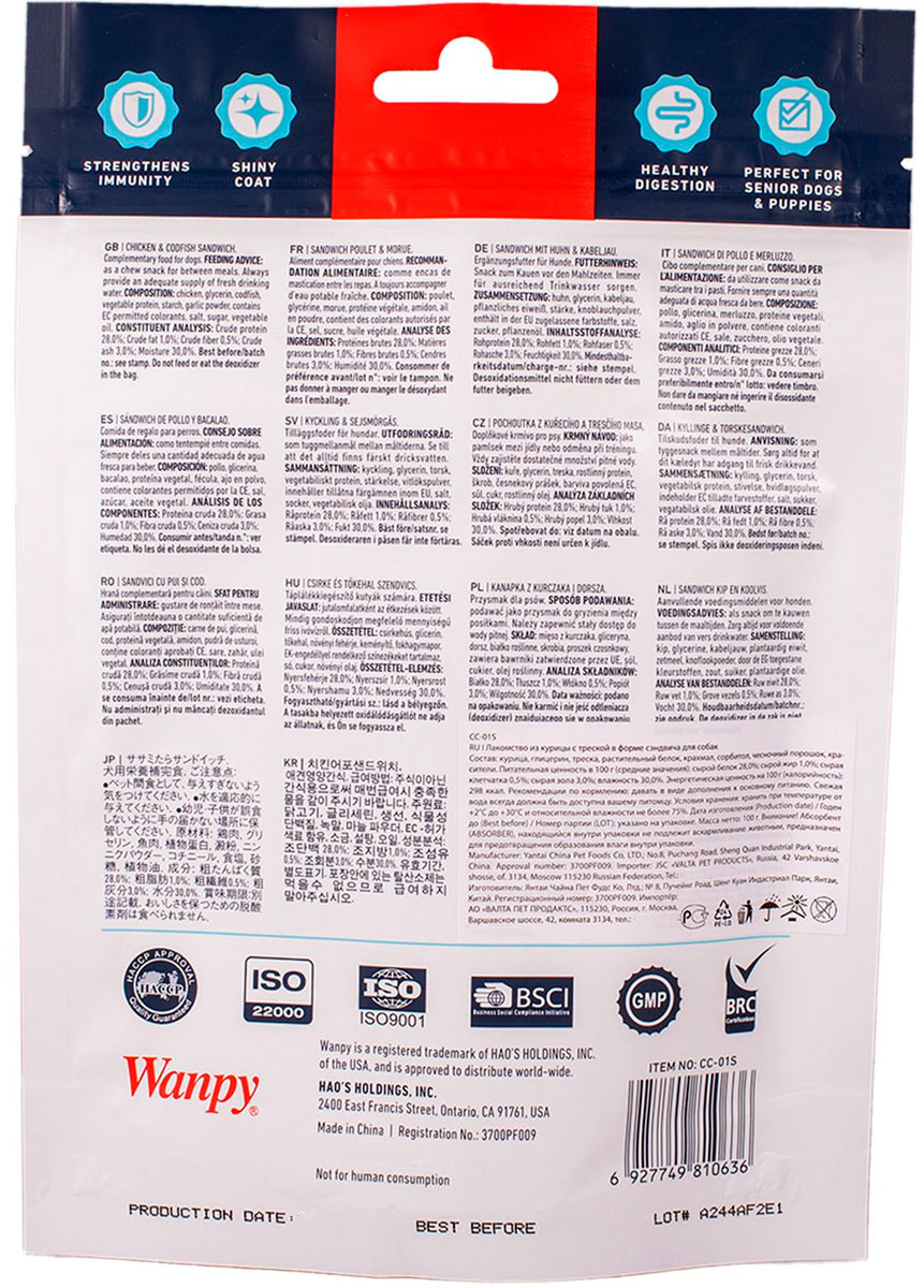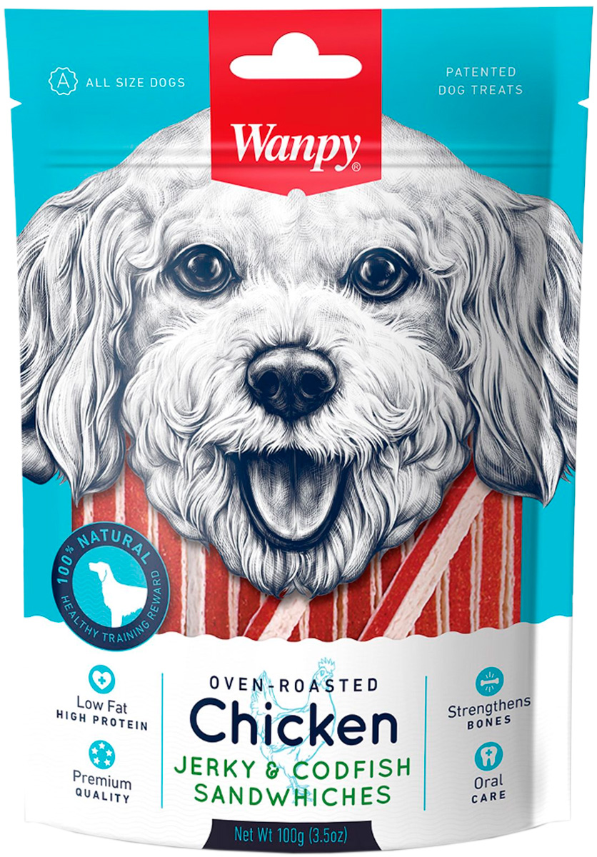 Сэндвичи из курицы и трески WANPY DOG служат дополнением к основному рациону собак, в частности, в качестве поощрения за хорошее поведение и выполнение команд, а также как источник дополнительных полезных веществ.