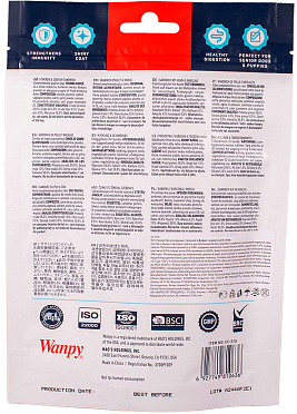 При изготовлении лакомств Wanpy используются только свежие продукты, что обеспечивает продукту высокое содержание протеина и низкий процент жира, а также гарантирует, что лакомство понравится Вашему питомцу.