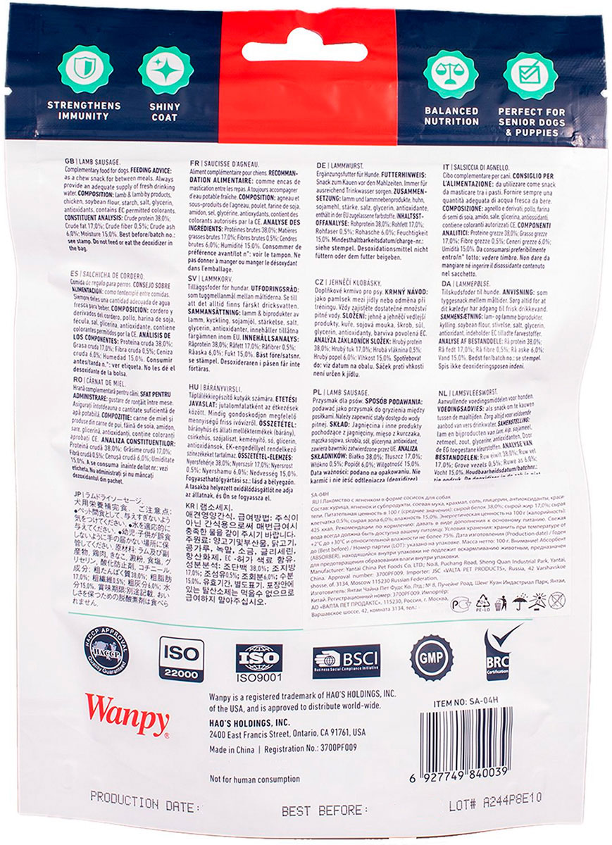 Сосиски из мяса ягненка WANPY DOG служат дополнением к основному рациону собак, в частности, в качестве поощрения за хорошее поведение и выполнение команд, а также как источник дополнительных полезных веществ.