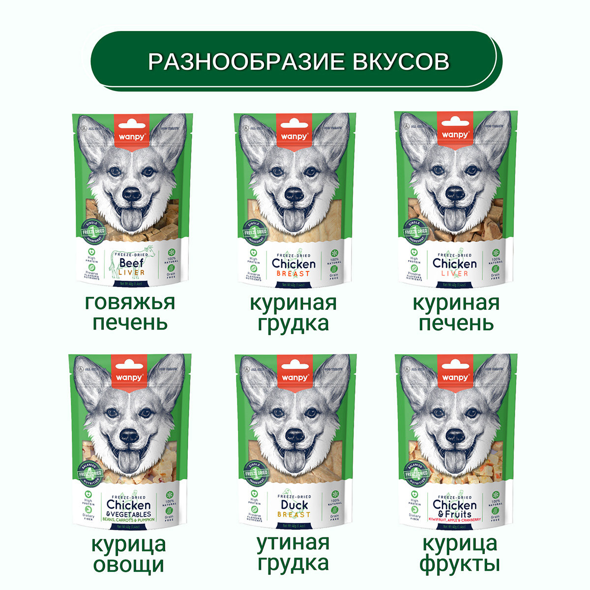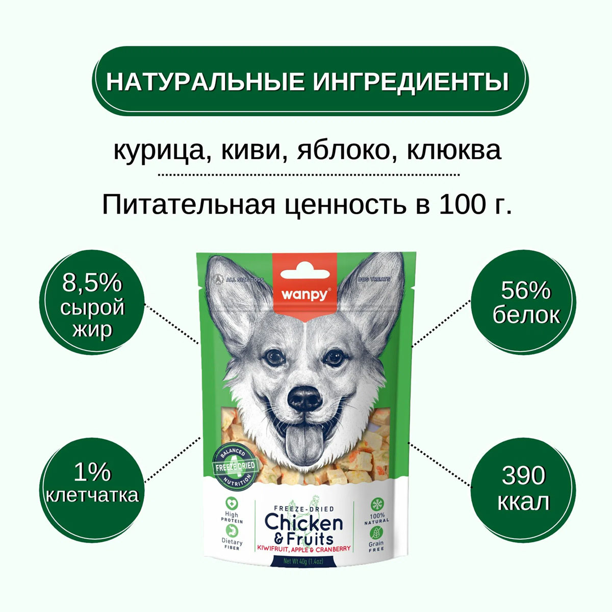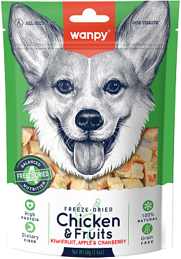 Wanpy Dog сублимированное лакомство для собак "Курица и фрукты" - это уникальное и полезное угощение, которое сделает день Вашего питомца ярче и вкуснее.
