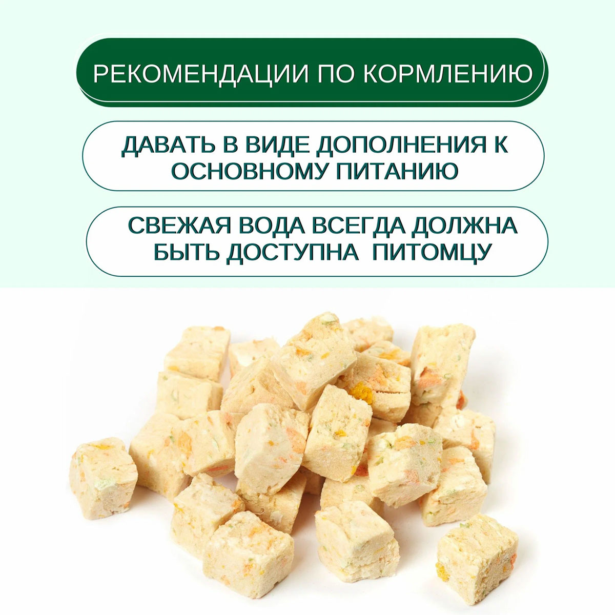 Рекомендации по кормлению: давать в виде дополнения к основному питанию. Свежая вода всегда должна быть доступна вашему питомцу.