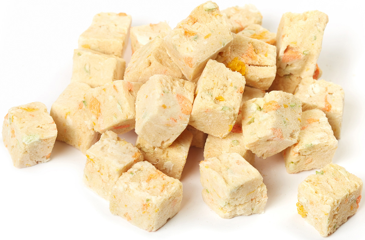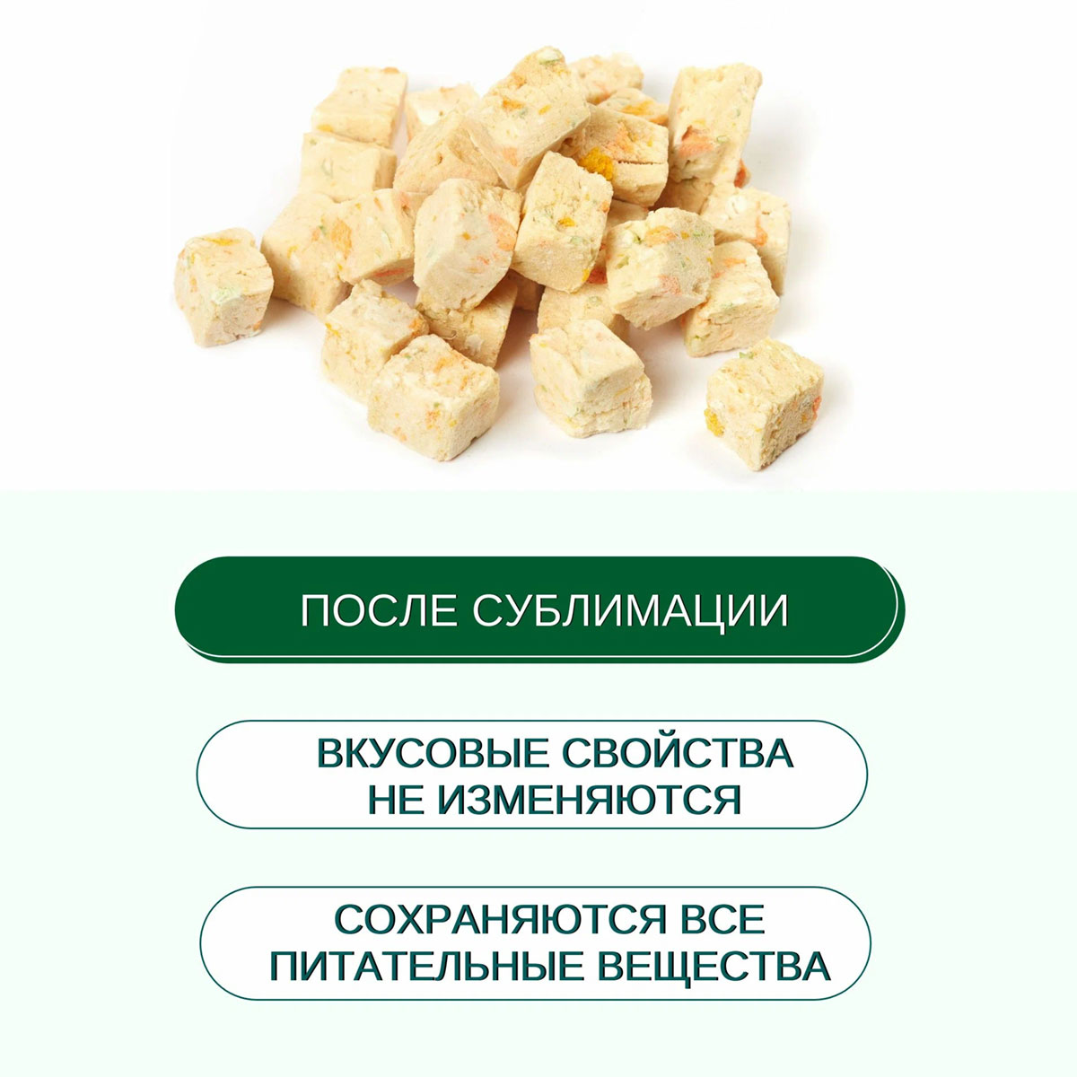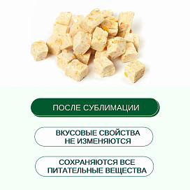 Лакомство состоит из натуральных ингредиентов - курицы, киви, яблока и клюквы. Благодаря специальному процессу сублимации, все полезные вещества и витамины сохраняются в продукте, при этом он становится еще более вкусным и ароматным.