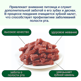 Особенностью лакомства является его форма в виде зубной щетки. Это не только привлекает внимание питомца, но и служит дополнительной заботой о его зубах и деснах. В процессе поедания лакомства активно очищается зубной налет, что способствует профилактике заболеваний полости рта.