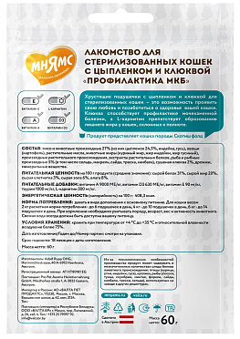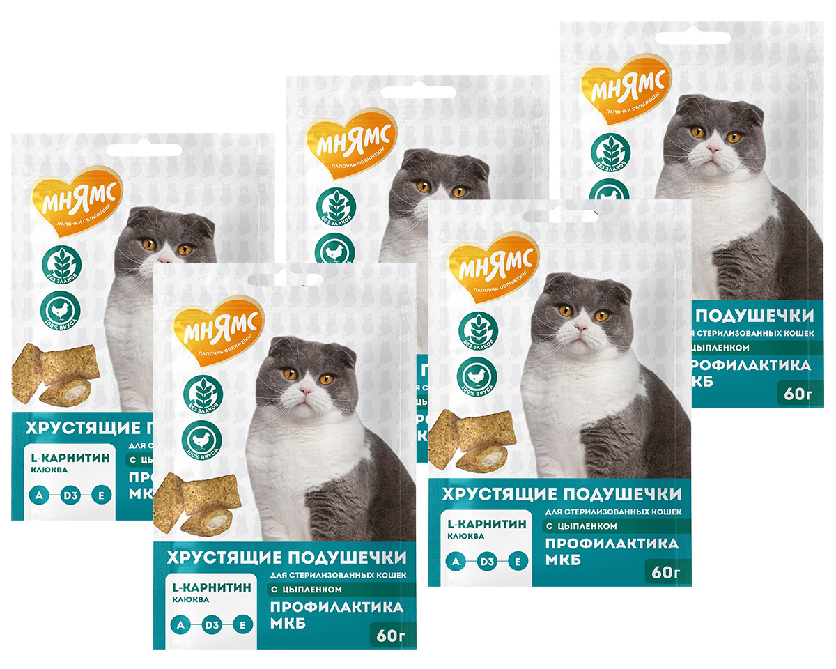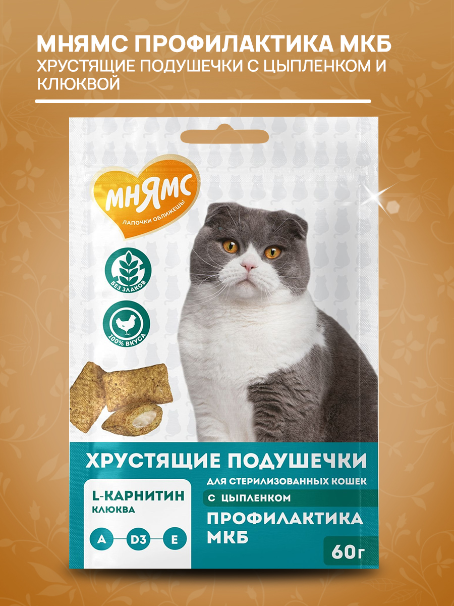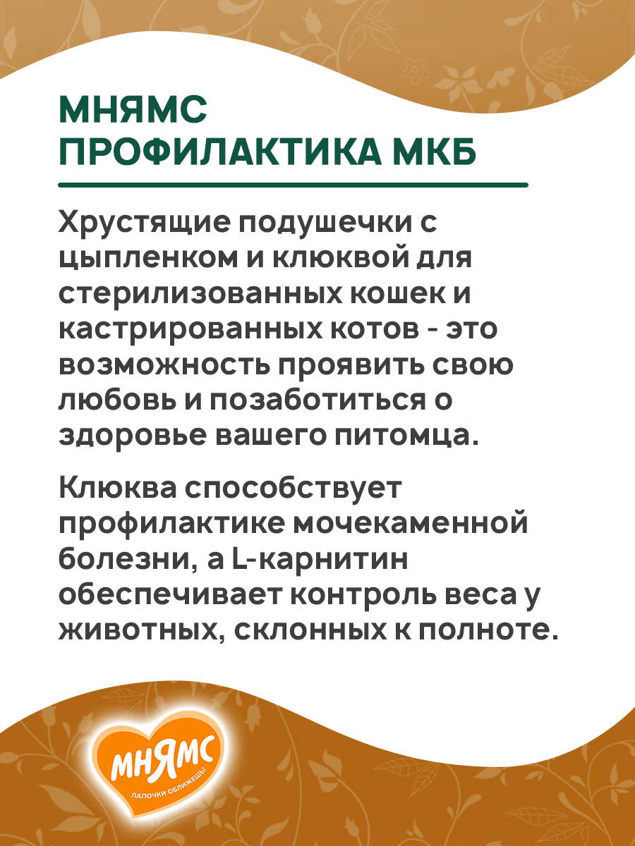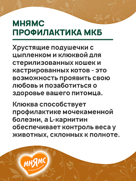 Лакомство для стерилизованных кошек МНЯМС ПРОФИЛАКТИКА МКБ хрустящие подушечки цыпленок, клюква (60 гр х 5 шт)