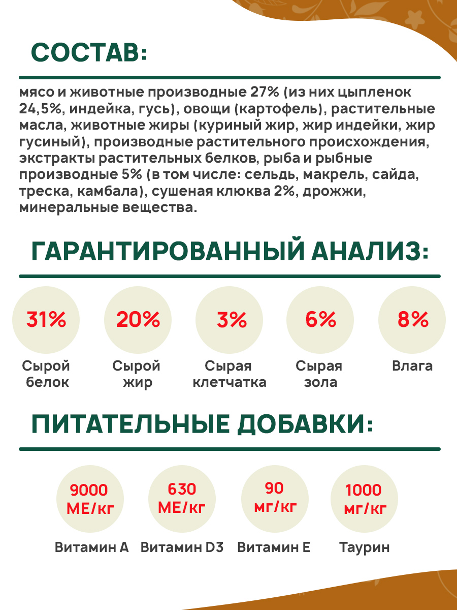 Состав: мясо и животные производные 27% (из них цыпленок 24,5%, индейка, гусь), овощи (картофель), растительные масла, животные жиры (куриный жир, жир индейки, жир гусиный), производные растительного происхождения, экстракты растительных белков, рыба и рыбные производные 5% (в том числе: сельдь, макрель, сайда, треска, камбала), сушеная клюква 2%, дрожжи, минеральные вещества.